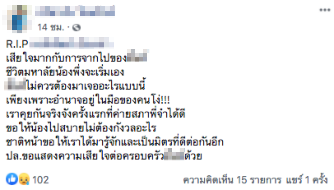 ทั้งนี้พบว่า ทางครอบครัวและเพื่อนของนักศึกษาสาวที่เสียชีวิต ได้โพสต์ข้อความแสดงความเสียใจต่อการจากไปจำนวนมาก โดยบางส่วนระบุว่า "เสียใจมากกับการจากไปของน้อง ชีวิตมหา'ลัยน้องเพิ่งจะเริ่มเอง น้องไม่ควรต้องมาเจออะไรแบบนี้ เพียงเพราะอำนาจอยู่ในมือของคนโง่ เราคุยกันจริงจังครั้งแรกที่ค่ายสภาพี่จำได้ดี