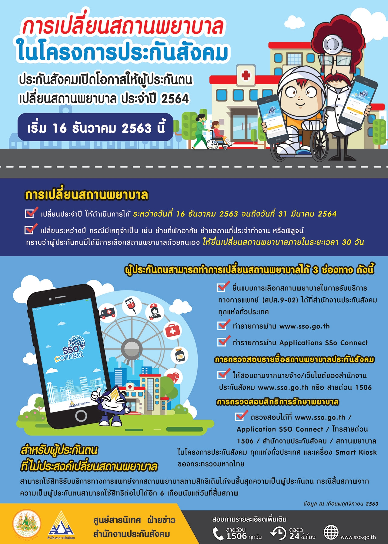 นายทศพล กฤตวงศ์วิมาน เลขาธิการสำนักงานประกันสังคม กระทรวงแรงงาน แจ้งว่า สำนักงานประกันสังคม ได้เปิดให้ผู้ประกันตนสามารถแจ้งขอเปลี่ยนแปลงสถานพยาบาลประจำปี 2564 หรือสนใจจะเปลี่ยนสถานพยาบาลระหว่างปี ด้วยเหตุจำเป็นไม่ได้รับความสะดวก ในการไปรับบริการทางการแพทย์ ณ สถานพยาบาลที่เลือกไว้ก่อนหน้านี้ เช่น ย้ายที่พักอาศัย ย้ายสถานที่ประจำทำงาน หากผู้ประกันตนมีความประสงค์จะเปลี่ยนสถานพยาบาล สามารถยื่นแบบเลือกสถานพยาบาลในการรับบริการทางการแพทย์ สปส.9-02 ได้ที่สำนักงานประกันสังคมกรุงเทพมหานครพื้นที่/จังหวัด/สาขาทุกแห่งทั่วประเทศ หรือทำรายการผ่านเว็บไซต์ www.sso.go.th และทำรายการผ่าน Applications SSO Connect ได้ตั้งแต่ 16 ธันวาคม 2563 จนถึงวันที่ 31 มีนาคม 2564