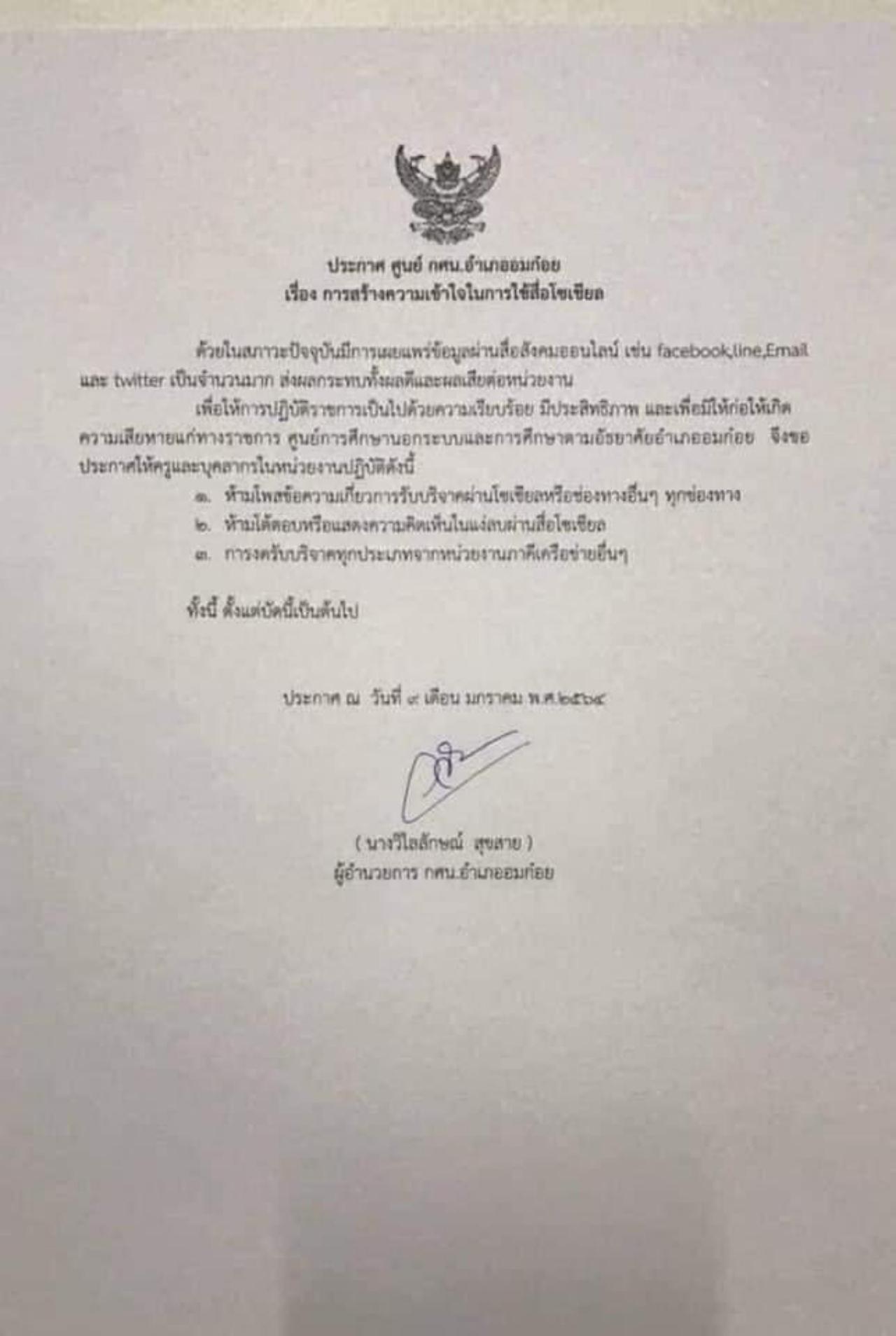 สืบเนื่องจากกรณีดังกล่าว มีรายงานว่า มีการเผยแพร่ประกาศ ของศูนย์ กศน.อมก๋อย ลงวันที่ 9 ม.ค. 2564 เรื่อง การสร้างความเข้าใจในการใช้สื่อโซเชียลในการสื่อสาร ระบุว่า ด้วยในสภาวะปัจจุบัน มีการเผยแพร่ข้อมูลผ่านสื่อสังคมออนไลน์เป็นจำนวนมาก ส่งผลกระทบต่อผลดี และผลเสียต่อหน่วยงาน