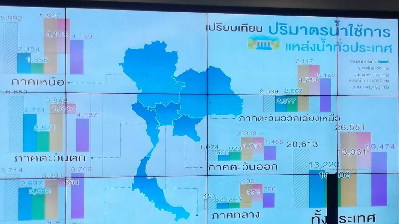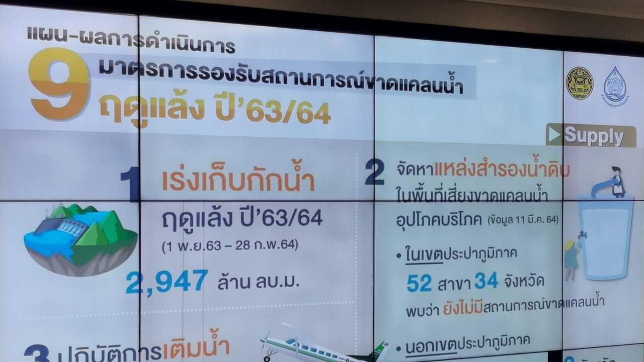 2563/2564 โดยมีผลการดำเนินการสำคัญ เช่น เร่งเก็บน้ำในแหล่งน้ำต่างๆ พบว่า ตั้งแต่เมื่อวันที่ 1 พ.ย.2563-28 ก.พ.2564 กักเก็บได้เพิ่มขึ้น 2,947 ล้านลูกบาศก์เมตร (ลบ.ม.) 2. การจัดหาแหล่งสำรองน้ำดิบ เพื่อป้องกันผลกระทบพื้นที่เสี่ยงขาดแคลนน้ำ พบว่า เขตการประปาส่วนภูมิภาค (กปภ.) ยังไม่มีสถานการณ์ขาดแคลนน้ำ นอกเขต กปภ. มีพื้นที่เฝ้าระวังขาดแคลนน้ำ 42 จังหวัด 22 อำเภอ 41 ตำบล นอกจากนั้นยังพบว่า มีพื้นที่เฝ้าระวังเพิ่มอีก 2 จังหวัด ได้แก่ เพชรบูรณ์และลำปาง