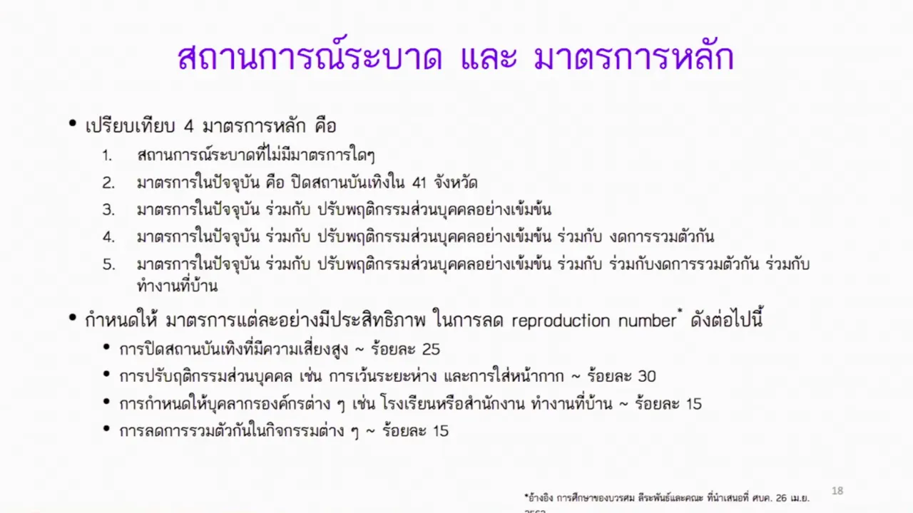 นพ.โสภณ เอี่ยมศิริถาวร รองอธิบดีกรมควบคุมโรค เผยแพร่ผลการศึกษาของกรมควบคุมโรค โดยกองระบาดวิทยา และกระทรวงสาธารณสุข ได้พัฒนาแบบจำลองทางคณิตศาสตร์ ใช้ข้อมูลที่เกิดขึ้นใหม่ และข้อมูลที่มีอยู่เดิม ทำการคาดการณ์การแพร่ระบาดของโควิด-19 ในประเทศไทย เพื่ออยากที่จะสื่อสารว่า เราต้องมีมาตรการที่เข้มข้นในการควบคุมเชื้อ เพื่อลดการแพร่ระบาดอย่างมีประสิทธิภาพ โดยเปรียบเทียบ 4 มาตรการหลัก คือ