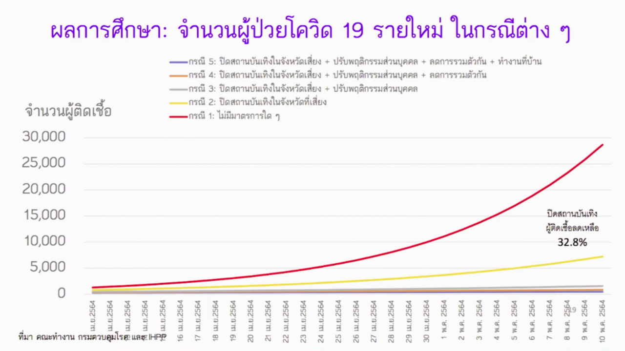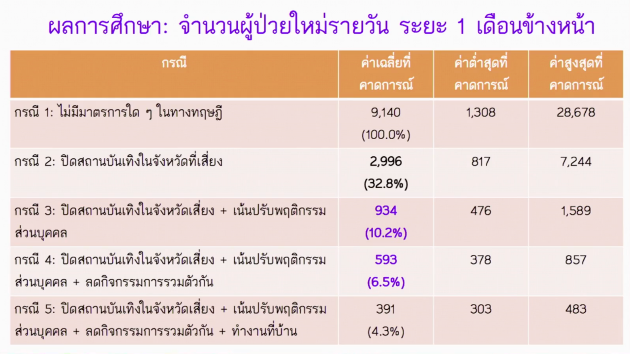 ผลของการศึกษา พบว่า หากไม่มีมาตรการใดๆ เลย ปล่อยให้การติดเชื้อเป็นไปอย่างธรรมชาติ จะมีผู้ติดเชื้อเพิ่มขึ้นเรื่อยๆ ในช่วงเวลาเดือนเศษ อาจเห็นผู้ติดเชื้อถึง 20,000 รายต่อวันได้ แต่หากมีมาตรการปิดสถานบันเทิง ใน 41 จังหวัด อย่างน้อยคาดว่า จะสามารถลดผู้ติดเชื้อได้ถึง 32.8% หรือเหลือผู้ป่วย 1 ใน 3 ก็ขอให้ทุกจังหวัดเข้มงวดกับสถานบันเทิง เพื่อไม่ให้คนไปแพร่เชื้อต่อ