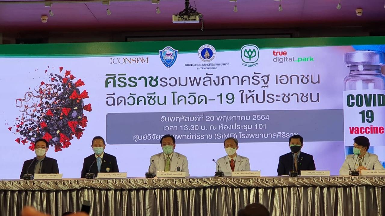 วันที่ 20 พฤษภาคม 2564 ศ.ดร.นพ.ประสิทธิ์ วัฒนาภา คณบดี คณะแพทยศาสตร์ศิริราชพยาบาล ม.มหิดล, รศ.นพ.วิศิษฎ์ วามวาณิชย์ ผู้อำนวยการ รพ.ศิริราช นายสนั่น อังอุบลกุล ประธานกรรมการหอการค้าไทยและสภาหอการค้าแห่งประเทศไทย นายศุภชัย เจียรวนนท์ ประธานคณะผู้บริหารเครือเจริญโภคภัณฑ์ นายสุพจน์ ชัยวัฒน์ศิริกุล กรรมการผู้จัดการ บริษัท ไอคอนสยาม จำกัด ร่วมแถลงข่าว ศิริราชรวมพลังภาครัฐ เอกชน ฉีดวัคซีนโควิด-19 ให้ประชาชน เพิ่มโอกาสสร้างภูมิคุ้มกันหมู่ในระดับที่สามารถยุติการแพร่ระบาดของโรคโควิด-19 ได้