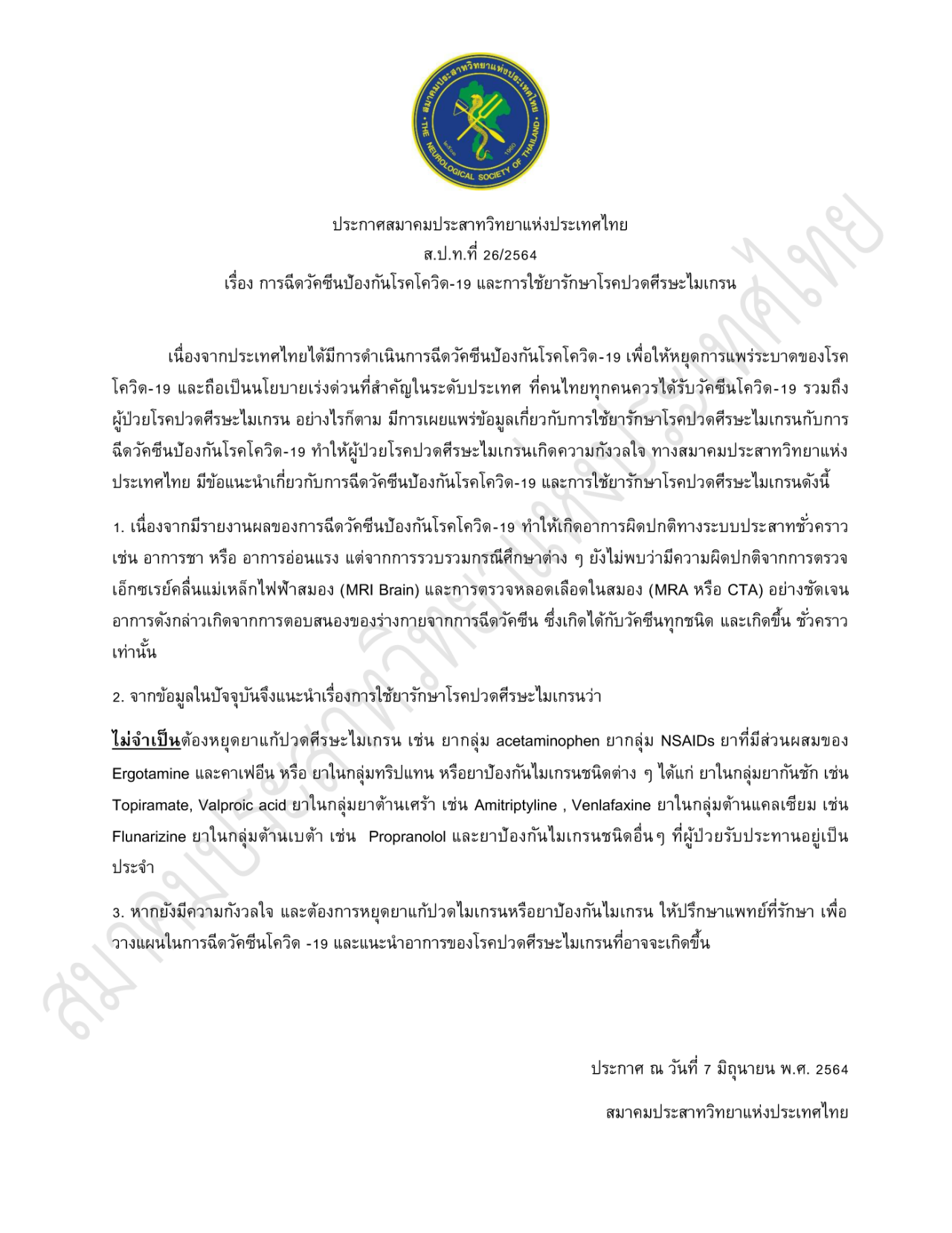 วันที่ 7 มิถุนายน 64 สมาคมประสาทวิทยาแห่งประเทศไทย ออกหนังสือชี้แจง เรื่องการฉีดวัคซีนป้องกันโรคโควิด และการใช้ยารักษาโรคปวดศีรษะไมเกรน