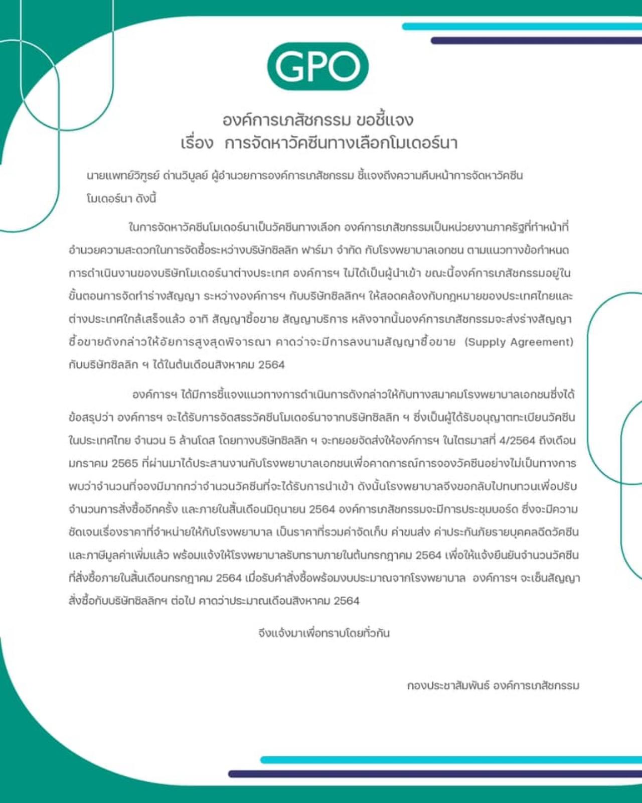 วันที่ 23 มิ.ย. นายแพทย์วิทูรย์ ด่านวิบูลย์ ผู้อํานวยการองค์การเภสัชกรรม ชี้แจงถึงความคืบหน้าการจัดหาวัคซีน โมเดอร์นา เป็นวัคซีนทางเลือก ว่า องค์การเภสัชกรรม เป็นหน่วยงานภาครัฐที่ทําหน้าที่อํานวยความสะดวกในการจัดซื้อระหว่างบริษัท ซิลลิก ฟาร์มา จํากัด กับโรงพยาบาลเอกชน ตามแนวทางข้อกําหนด การดําเนินงานของบริษัทโมเดอร์นาต่างประเทศ องค์การฯ ไม่ได้เป็นผู้นําเข้า