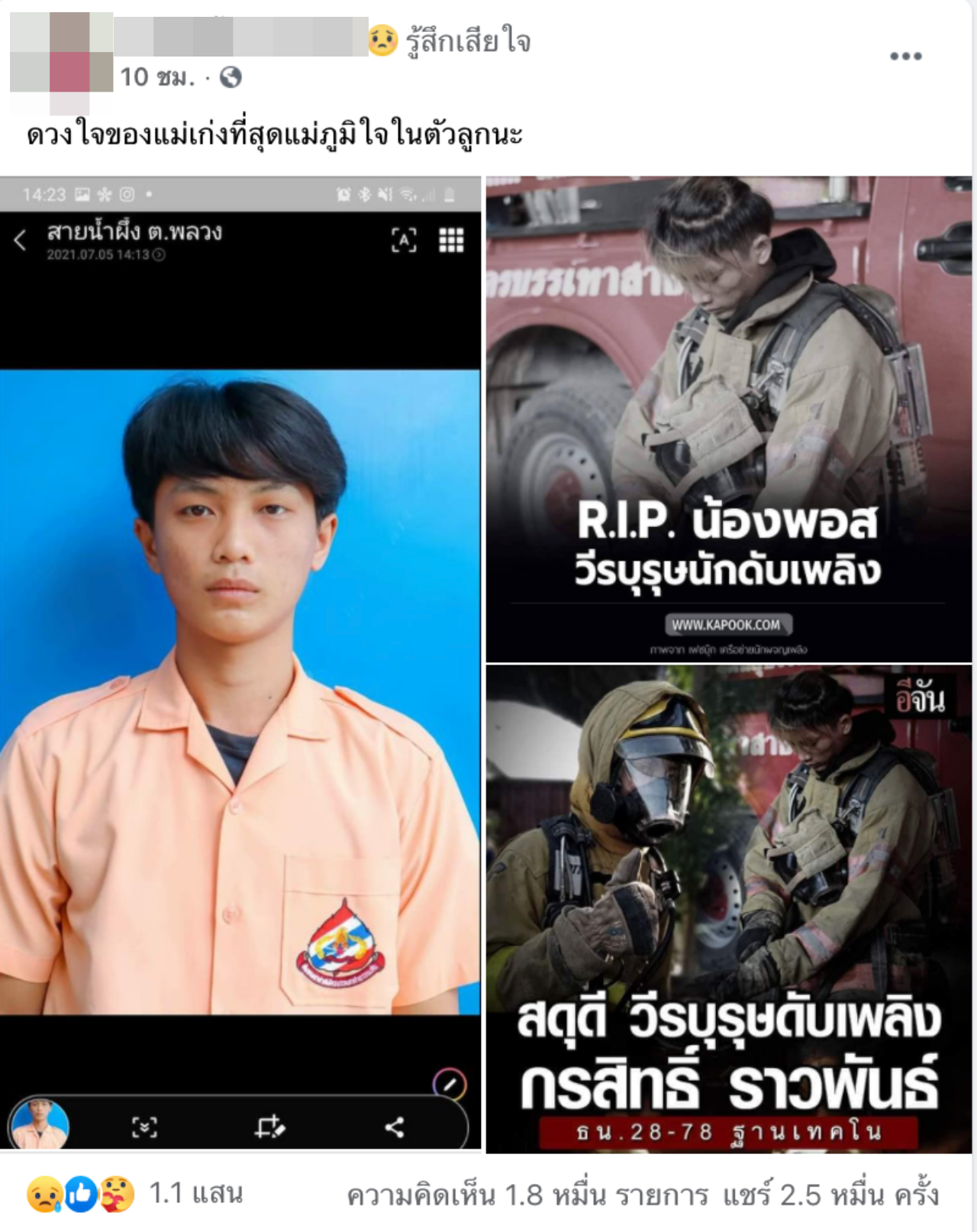 สุดเศร้า "แม่น้องพอส" โพสต์ข้อความหลังสูญเสียลูกชาย เหตุเพลิงไหม้โรงงานกิ่งแก้ว ขณะที่ชาวเน็ตแห่แสดงความเสียใจเป็นจำนวนมาก