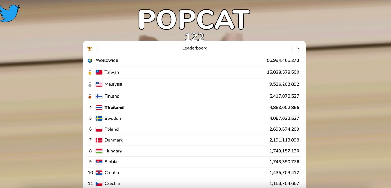 โดยกระแสของเกมนี้ ทำให้ชาวเน็ตไทยไม่พลาดเข้าร่วมเพื่อชิงการเป็นที่ 1 ระดับโลก โดยสามารถทะยานขึ้นมาเป็นอันดับ 4 ได้ในเวลาช่วงข้ามคืน (อัปเดตข้อมูล 09.50 น.) ส่งผลให้แฮชแท็ก #popcat พุ่งติดอันดับ 1 ในเทรนด์ทวิตเตอร์ ซึ่งมีการแสดงความคิดเห็นเกี่ยวกับประเด็นดังกล่าวกันเป็นจำนวนมาก.