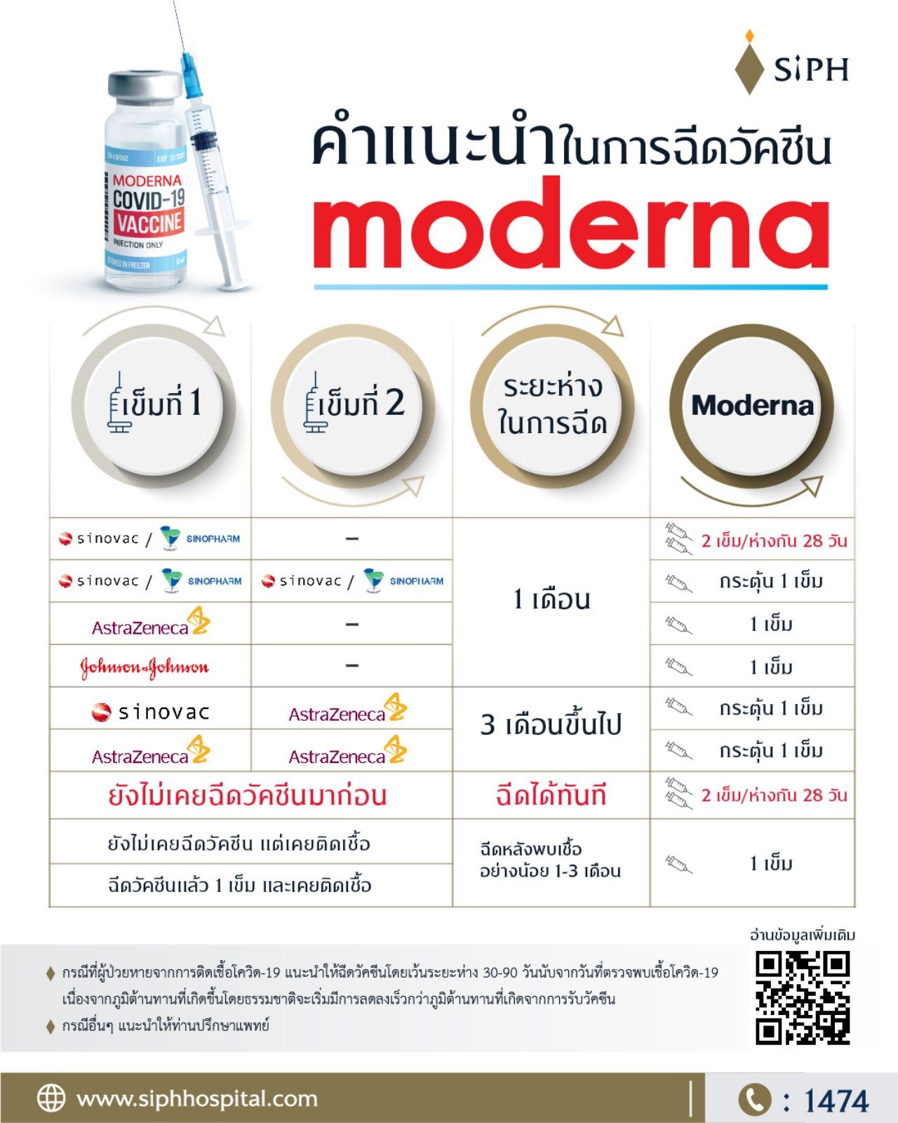โรงพยาบาลศิริราช ปิยมหาราชการุณย์ ได้ประกาศผ่านเฟซบุ๊ก แจ้งเปิดจองวัคซีนทางเลือก moderna ตั้งแต่วันที่ 22 กันยายน 2564 เป็นต้นไป ราคาเข็มละ 1,500 บาท (รวมค่าบริการฉีด) ผ่านทาง https://www.siphhospital.com/ หรือ Scan QR Code (ระบบจะเปิดเมื่อถึงวันจอง)
