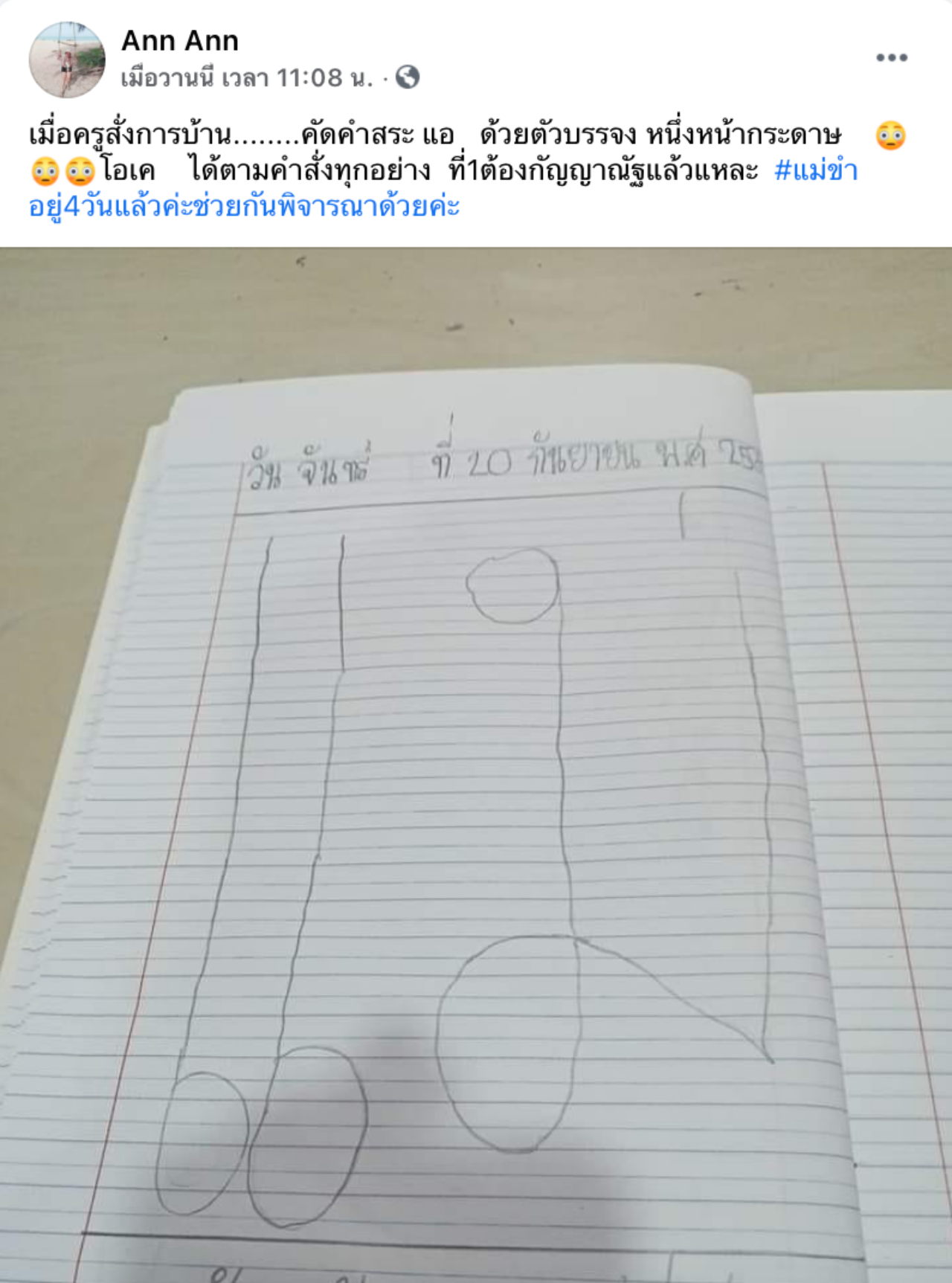 ผู้ใช้เฟซบุ๊ก Ann Ann ได้โพสต์ข้อความสุดขำผ่านกลุ่ม HerKid รวมพลคนเห่อลูก โดยระบุข้อความว่า "เมื่อครูสั่งการบ้าน คัดคำสระแอด้วยตัวบรรจง หนึ่งหน้ากระดาษ โอเคได้ตามคำสั่งทุกอย่าง ที่ 1 ต้องกัญญาณัฐแล้วแหละ แม่ขำอยู่4วันแล้ว ช่วยกันพิจารณาด้วยค่ะ"