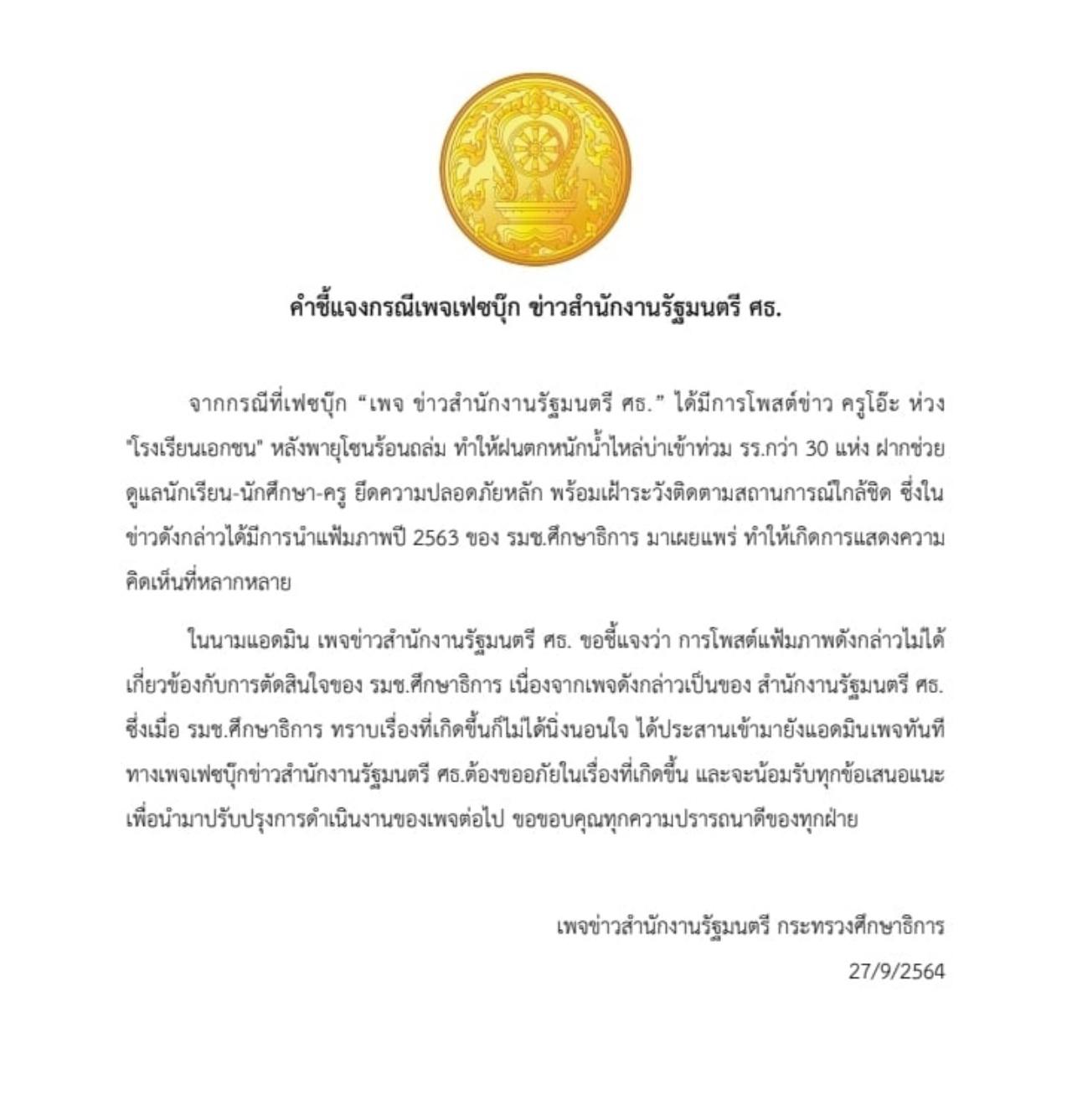 ต่อมาทางแฟนเพจได้เผยแพร่หนังสือชี้แจง ในนามแอดมิน เพจข่าวสำนักงานรัฐมนตรี ศธ. ระบุว่า การโพสต์แฟ้มภาพดังกล่าวไม่ได้เกี่ยวข้องกับการตัดสินใจของ รมช.ศึกษาธิการ เนื่องจากเพจดังกล่าวเป็นของสำนักงานรัฐมนตรี ศธ. ซึ่งเมื่อ รมช.ศึกษาธิการ ทราบเรื่องที่เกิดขึ้น ก็ไม่ได้นิ่งนอนใจ ได้ประสานเข้ามายังแอดมินเพจทันที