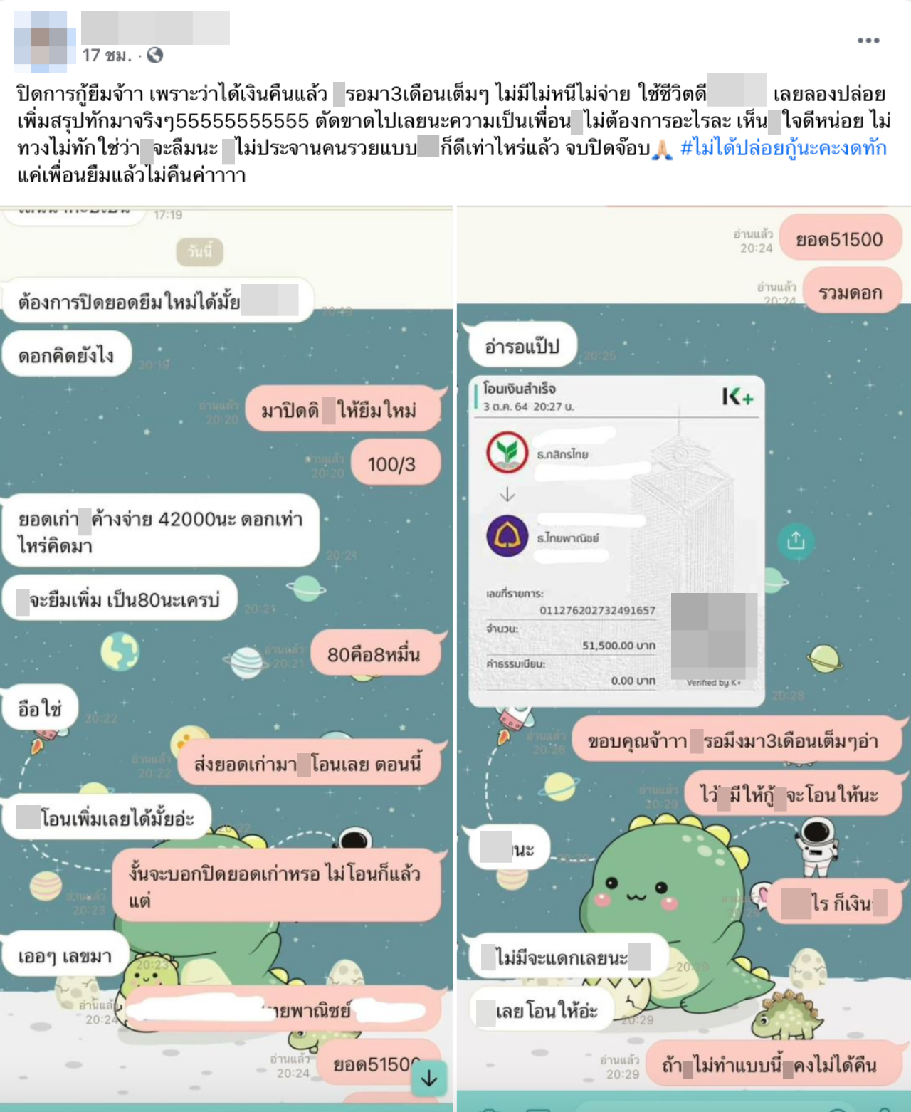 ทั้งนี้ ยังระบุข้อความด้วยอีกว่า ปิดการกู้ยืมจ้า เพราะว่าได้เงินคืนแล้ว รอมา 3 เดือนเต็มๆ ไม่มี ไม่หนี ไม่จ่าย ใช้ชีวิตดี เลยลองปล่อยเพิ่มสรุปทักมาจริงๆ ตัดขาดไปเลยนะความเป็นเพื่อน ไม่ต้องการอะไรละ เห็นใจดีหน่อย ไม่ทวง ไม่ทัก ใช่ว่าจะลืมนะ ไม่ประจานคนรวยก็ดีเท่าไหร่แล้ว จบปิดจ๊อบ ไม่ได้ปล่อยกู้ งดทัก แค่เพื่อนยืมแล้วไม่คืน