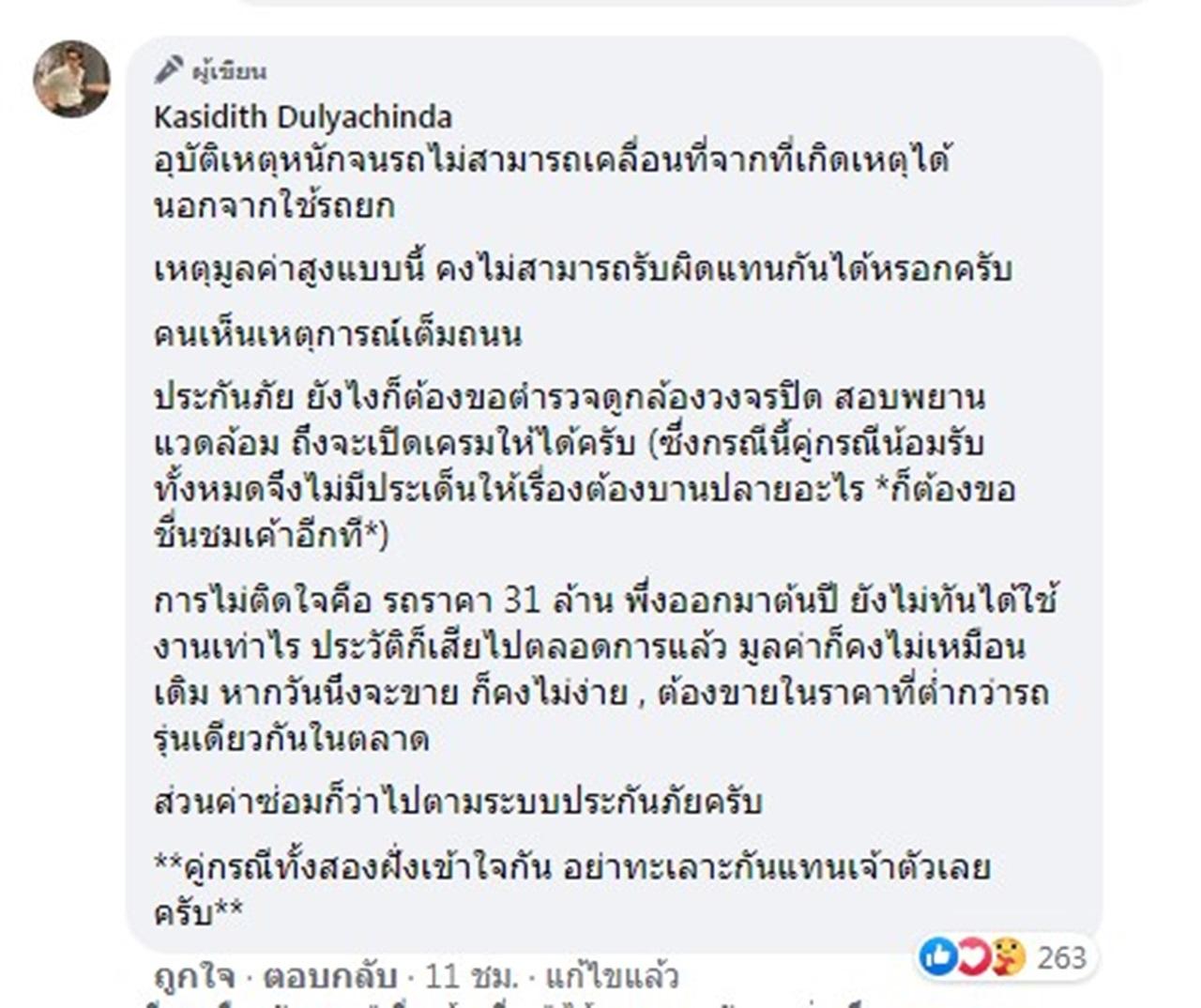 นอกจากนี้ ยังระบุอีกว่า อุบัติเหตุหนักจนรถไม่สามารถเคลื่อนที่จากที่เกิดเหตุได้ นอกจากใช้รถยก เหตุมูลค่าสูงแบบนี้ คงไม่สามารถรับผิดแทนกันได้หรอกครับ คนเห็นเหตุการณ์เต็มถนน ประกันภัย ยังไงก็ต้องขอตำรวจดูกล้องวงจรปิด สอบพยานแวดล้อม ถึงจะเปิดเคลมให้ได้ครับ (ซึ่งกรณีนี้คู่กรณีน้อมรับทั้งหมดจึงไม่มีประเด็นให้เรื่องต้องบานปลายอะไร ก็ต้องขอชื่นชมเขาอีกที)
