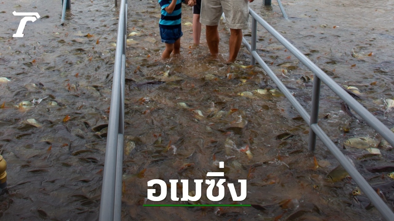 นักท่องเที่ยวตื่นตาพบปลาหลากสายพันธุ์ว่ายบนสะพานเชื่อมไปยังแพปลา "วัดพนัญเชิง" หลังระดับน้ำท่วมสูง