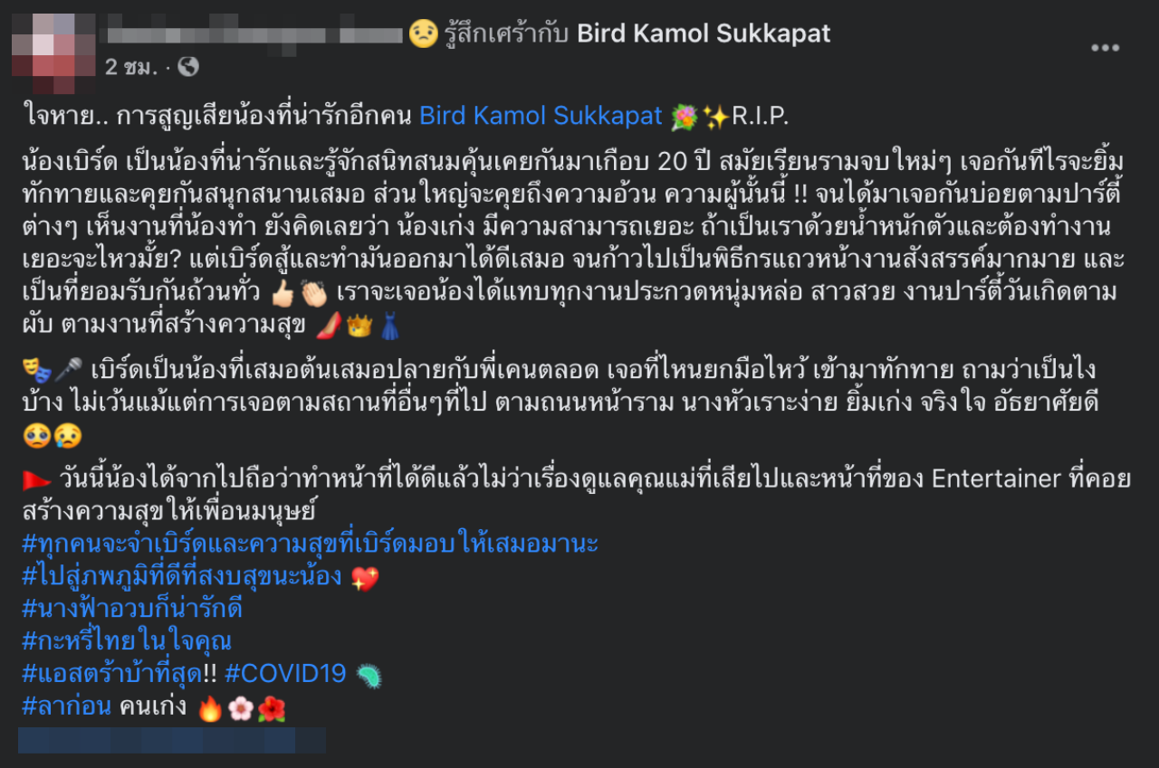 เฟซบุ๊กเพจ "รายการ เฮฮา ภาษาตุ๊ด" โพสต์ข้อความแจ้งว่า "Rip พี่เบิร์ด พิธีกร รายการเฮฮาภาษาตุ๊ด พี่เบิร์ด เป็นโควิดลงปอด เสียเวลา 03:30 เสียใจมากที่สุดวันนี้ จากไปแบบไม่มีวันกลับมาอีกแล้ว"