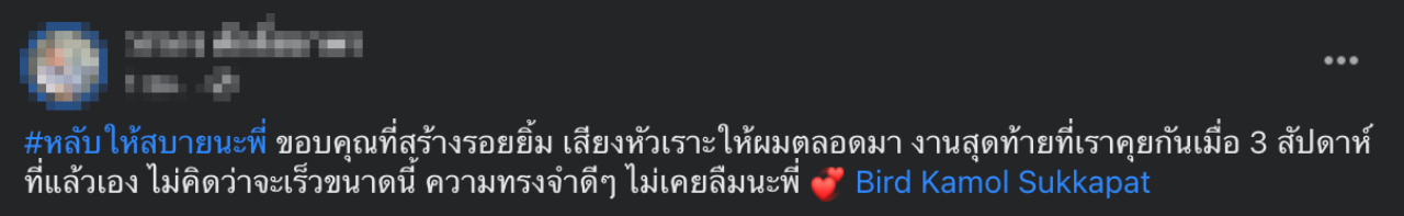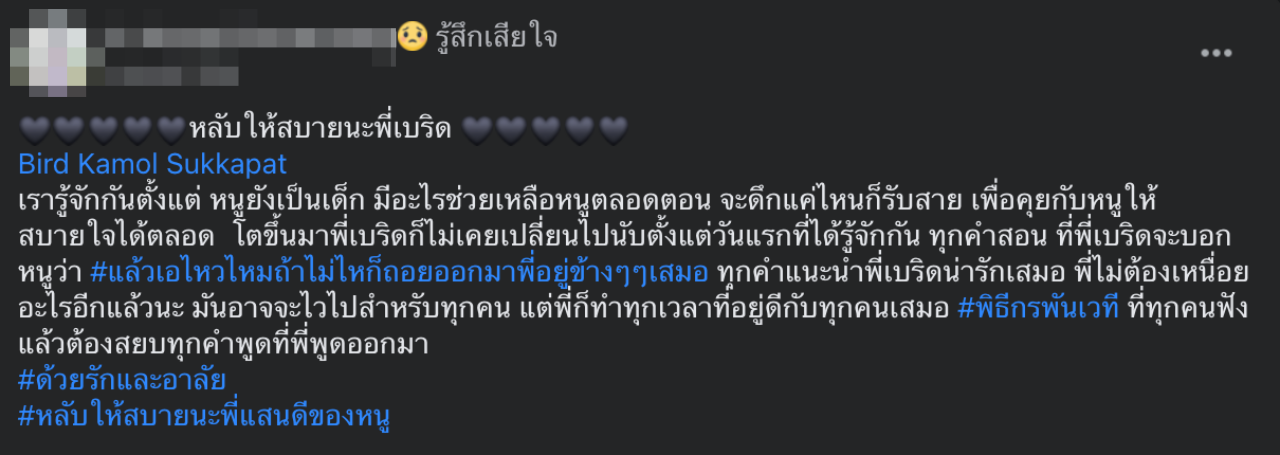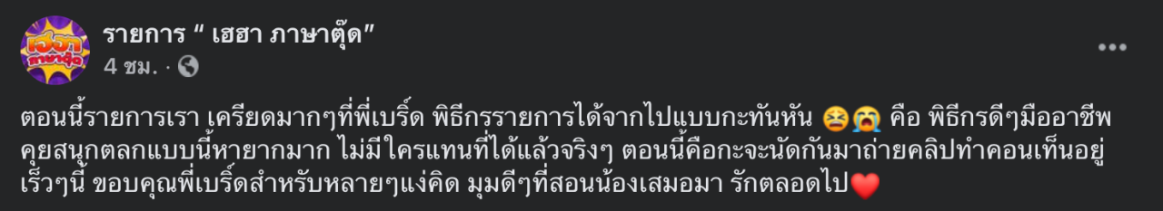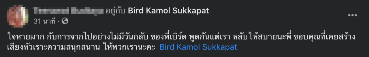 "ตอนนี้รายการเรา เครียดมากๆที่พี่เบิร์ด พิธีกรรายการได้จากไปแบบกะทันหัน คือ พิธีกรดีๆ มืออาชีพ คุยสนุกตลกแบบนี้หายากมาก ไม่มีใครแทนที่ได้แล้วจริงๆ ตอนนี้คือกะจะนัดกันมาถ่ายคลิปทำคอนเทนต์อยู่เร็วๆนี้ ขอบคุณพี่เบิร์ดสำหรับหลายๆแง่คิด มุมดีๆ ที่สอนน้องเสมอมา รักตลอดไป"