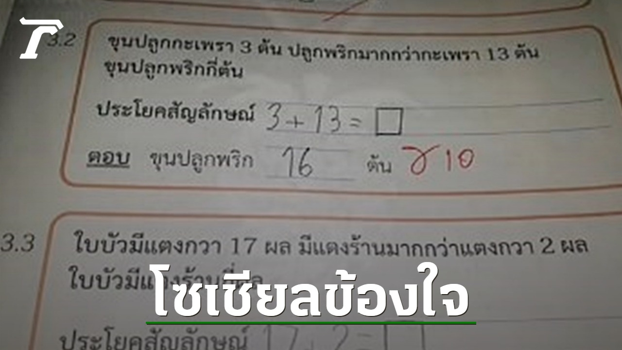 จากกรณีโลกออนไลน์แชร์โจทย์การบ้านวิชาคณิตศาสตร์ ที่ถามว่า "ขุนปลูกกะเพรา 3 ต้น ปลูกพริกมากกว่ากะเพรา 13 ต้น ขุนปลูกพริกกี่ต้น?" โดยเด็กนักเรียนเขียนคำตอบว่า "13+3 = 16 ต้น" แต่ครูได้กากบาทและเฉลยว่า 10 ต้น