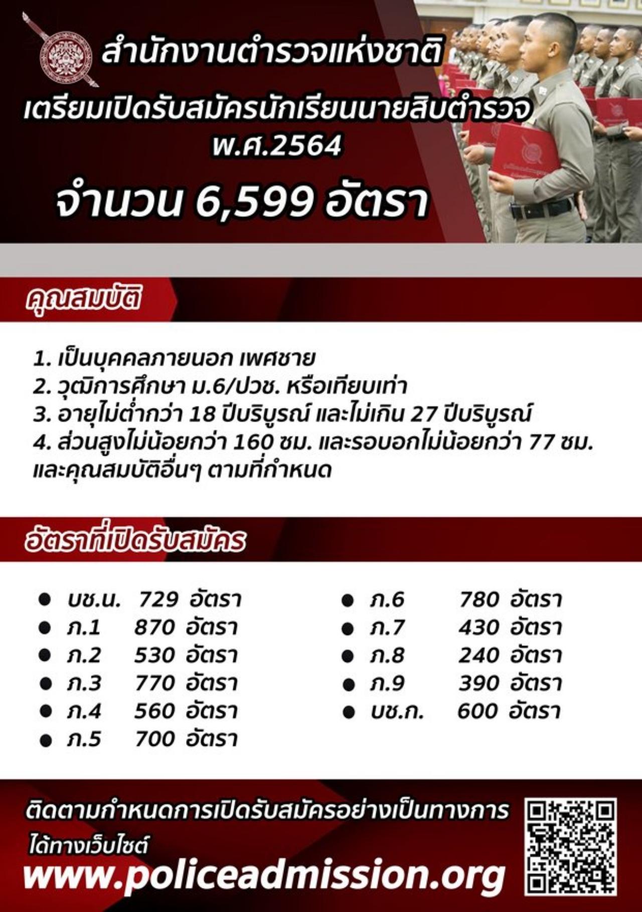วันที่ 23 พฤศจิกายน 2564 มีรายงานว่า เว็บไซต์กองการสอบ ได้เผยแพร่ข่าวประชาสัมพันธ์เรื่อง สำนักงานตำรวจแห่งชาติ เตรียมเปิดรับสมัครนักเรียนนายสิบตำรวจ พ.ศ.2564 จำนวน 6,599 อัตรา โดยมีคุณสมบัติดังต่อไปนี้