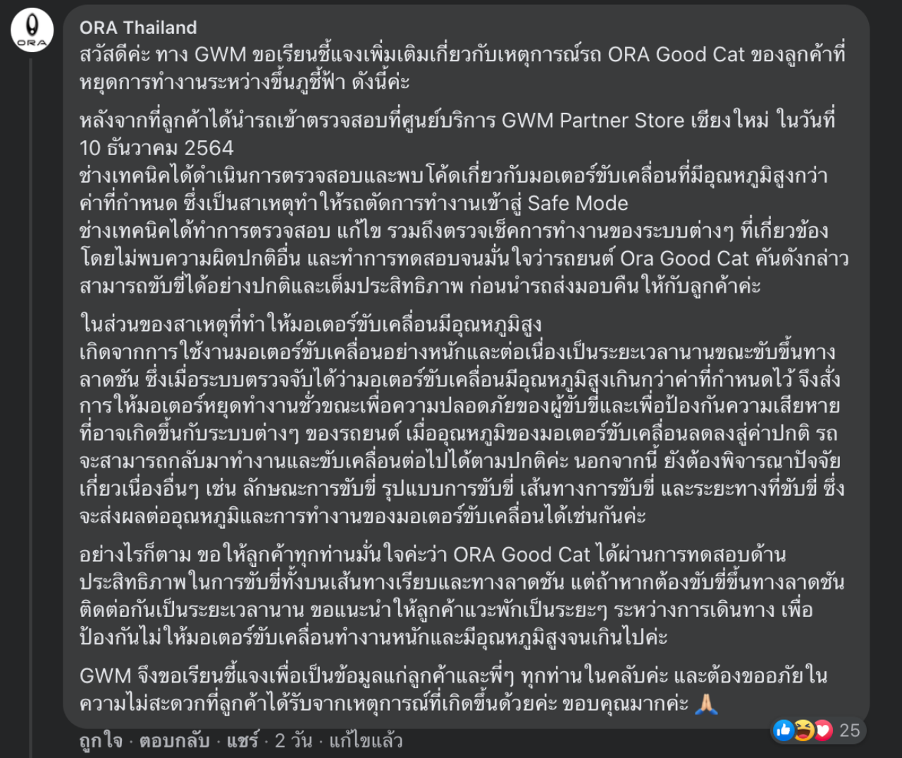 เกี่ยวกับเรื่องนี้ เฟซบุ๊กเพจ "ORA Thailand" ได้โพสต์ข้อความชี้แจงใต้โพสต์ของผู้ใช้งานว่า ทาง GWM ขอเรียนชี้แจงเพิ่มเติมเกี่ยวกับเหตุการณ์รถ ORA Good Cat ของลูกค้าที่หยุดการทำงานระหว่างขึ้นภูชี้ฟ้า ดังนี้