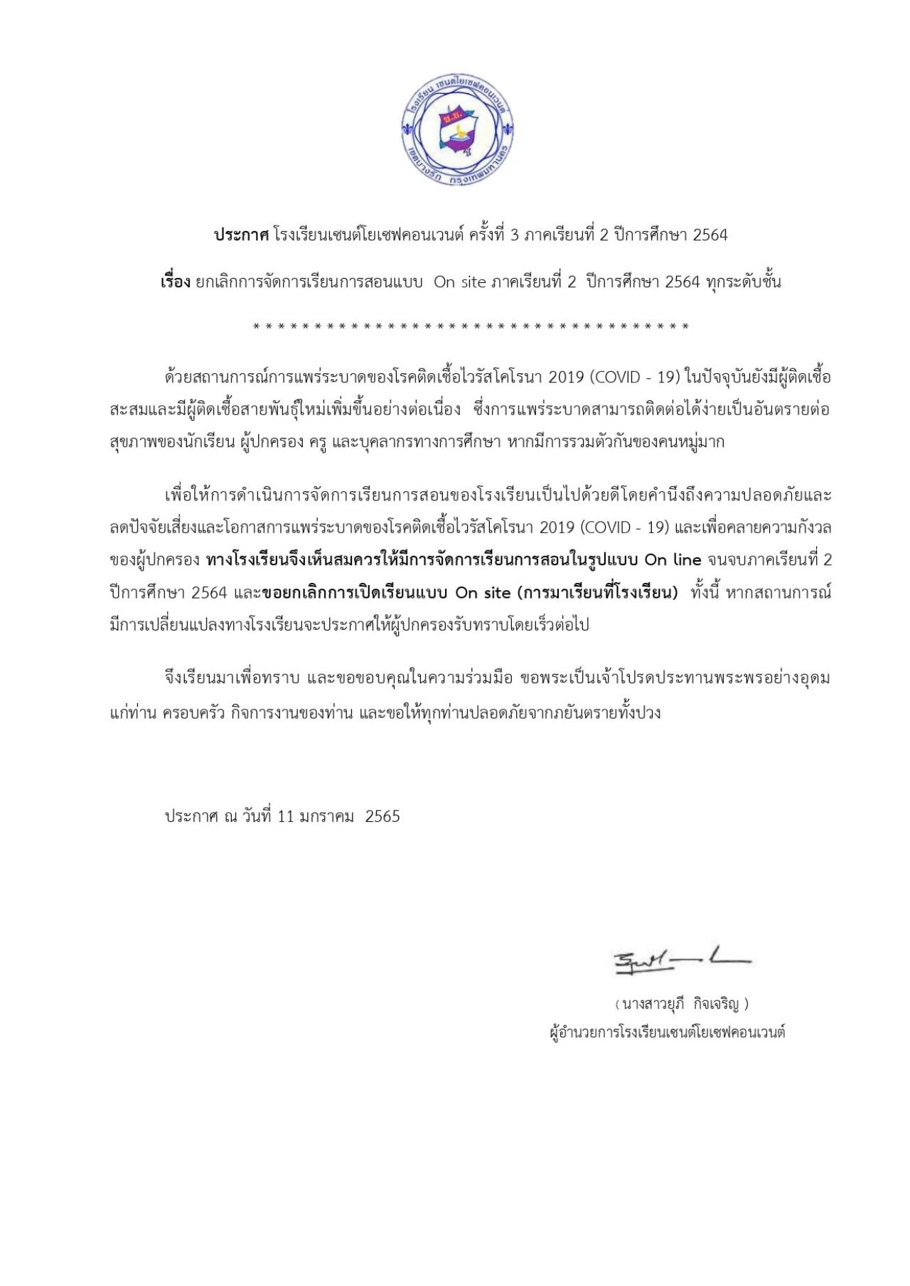 โรงเรียนเซนต์โยเซฟคอนเวนต์ ประกาศผ่านเฟซบุ๊ก เรื่อง ยกเลิกการจัดการเรียนการสอนแบบ On site ภาคเรียนที่ 2 ปีการศึกษา 2564 ทุกระดับชั้น โดยนางสาวยุภี กิจเจริญ ผู้อำนวยการโรงเรียนเซนต์โยเซฟคอนเวนต์ ลงวันที่ 11 มกราคม 2565 ระบุว่า ด้วยสถานการณ์การแพร่ระบาดของโรคติดเชื้อไวรัสโคโรนา 2019 (COVID-19) ในปัจจุบันยังมีผู้ติดเชื้อ สะสมและมีผู้ติดเชื้อสายพันธุ์ใหม่เพิ่มขึ้นอย่างต่อเนื่อง ซึ่งการแพร่ระบาดสามารถติดต่อได้ง่ายเป็นอันตรายต่อ สุขภาพของนักเรียน ผู้ปกครอง ครู และบุคลากรทางการศึกษา หากมีการรวมตัวกันของคนหมู่มาก