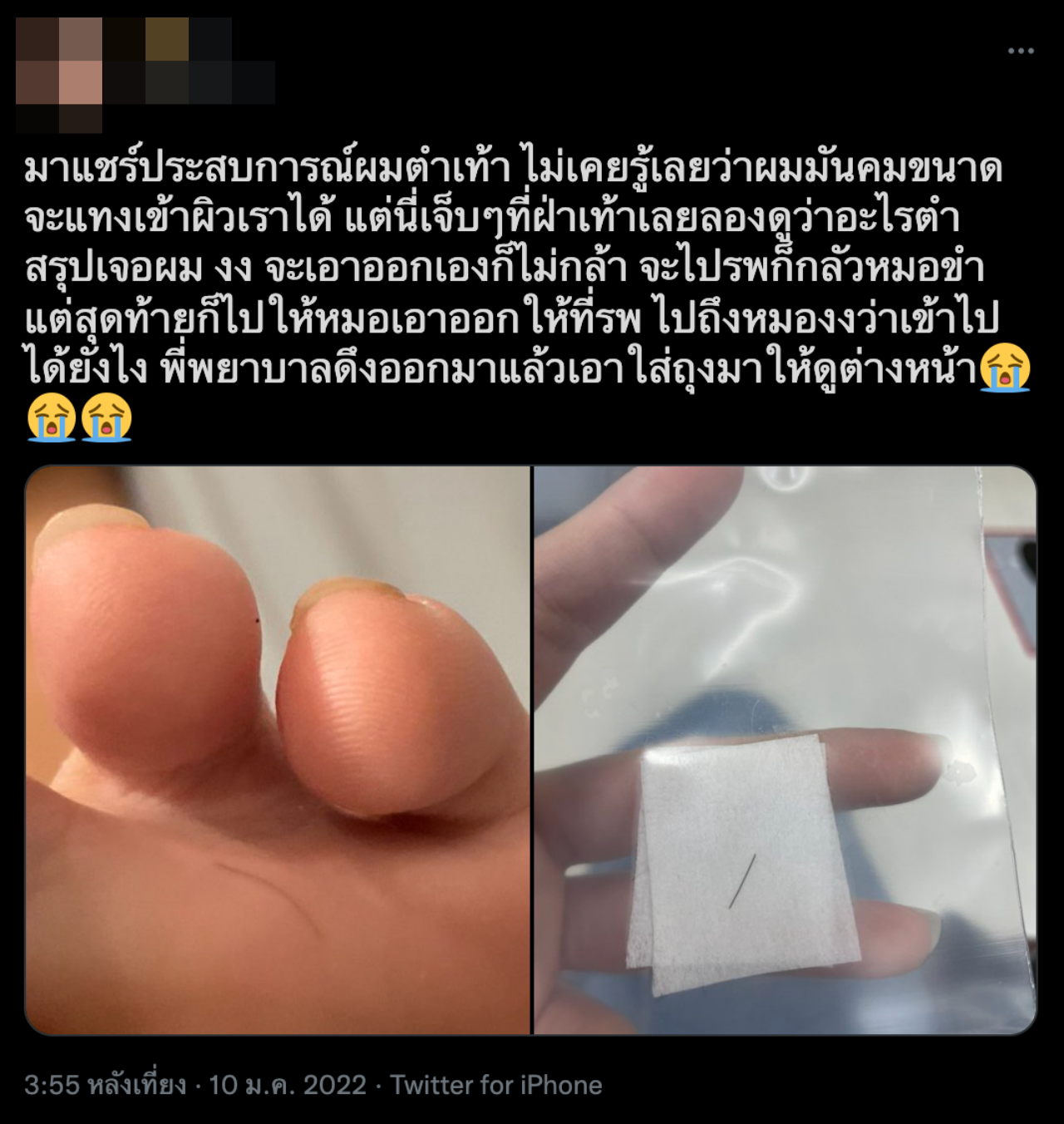สาวทวีตข้อความ แชร์ประสบการณ์ เส้นผมแทงเข้าผิวหนัง ที่ฝ่าเท้า จนเริ่มอักเสบ เสี่ยงติดเชื้อ แต่โชคดีที่ไปให้หมอที่ รพ. เอาออกให้ทัน