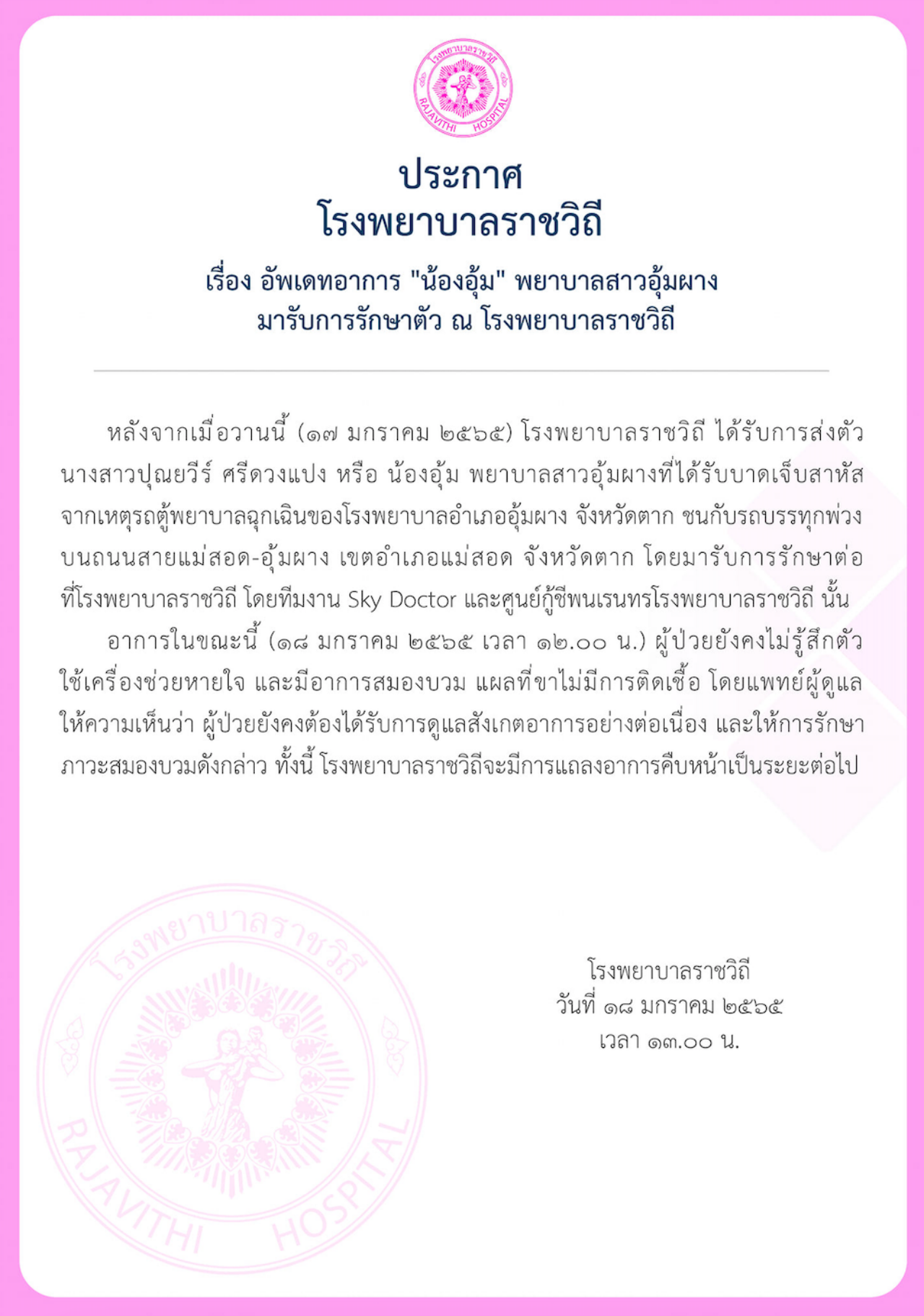 วันที่ 18 ม.ค. 2565 โรงพยาบาลราชวิถี แจ้งอาการ นางสาวปุณยวีร์ ศรีดวงแปง หรือ น้องอุ้ม หลังจากเมื่อวานนี้ (17 ม.ค.) ได้รับการส่งตัวพยาบาลสาวอุ้มผางที่ได้รับบาดเจ็บสาหัสจากเหตุรถตู้พยาบาลฉุกเฉินของโรงพยาบาลอำเภออุ้มผาง จังหวัดตาก ชนกับรถบรรทุกพ่วงบนถนนสายแม่สอด-อุ้มผาง เขตอำเภอแม่สอด จังหวัดตาก โดยมารับการรักษาต่อที่โรงพยาบาลราชวิถี โดยทีมงาน Sky Doctor และศูนย์กู้ชีพนเรนทรโรงพยาบาลราชวิถี นั้น