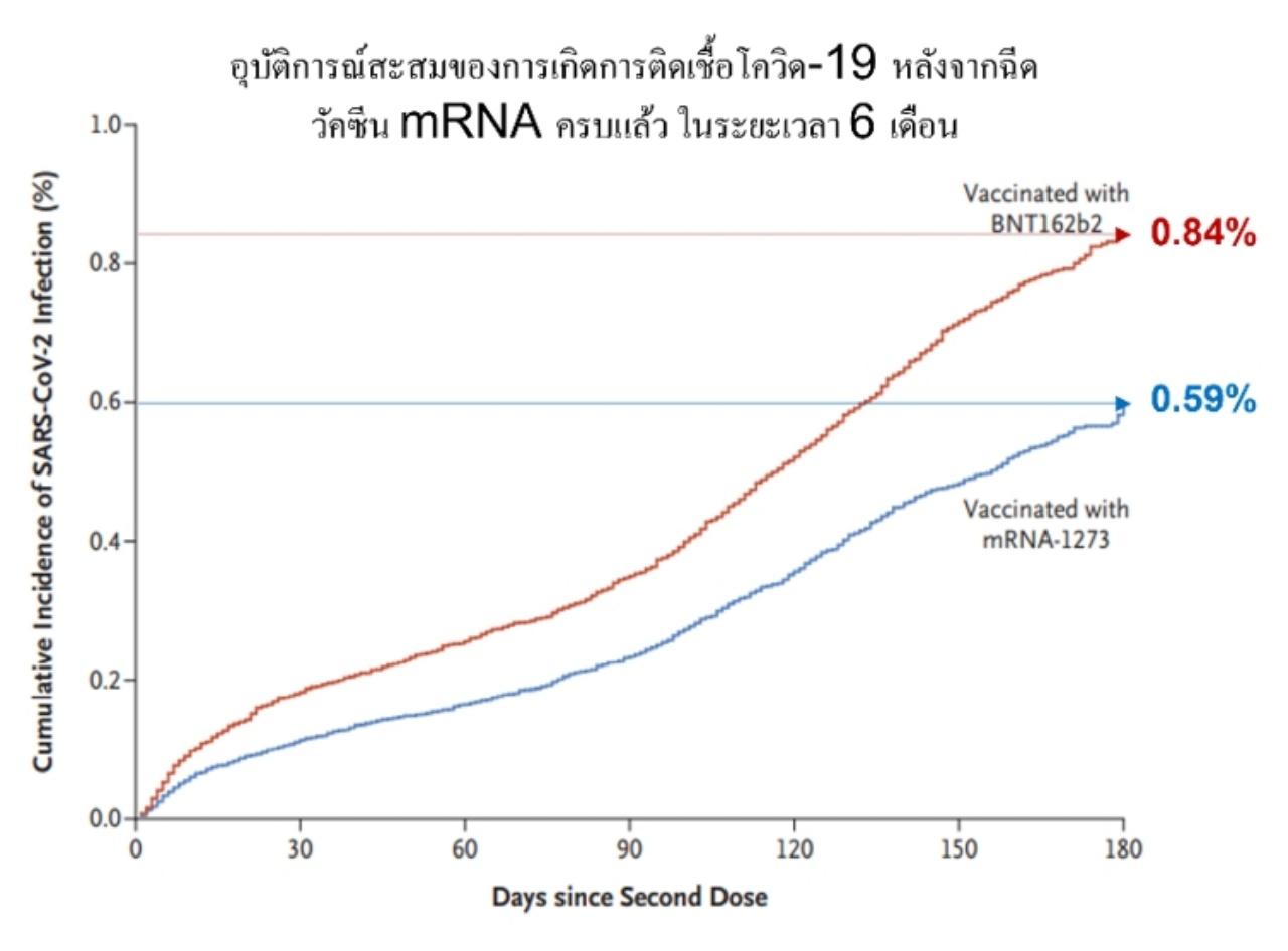 ทั้งนี้ จากการติดตามผลหลังได้รับวัคซีนเข็มที่ 2 ไปแล้วเป็นระยะเวลา 6 เดือน พบว่าในกลุ่มที่ได้รับวัคซีนโมเดอร์นา มีอุบัติการณ์สะสมของการติดเชื้ออยู่ที่ 0.59% ส่วนกลุ่มผู้ที่ได้รับวัคซีนไฟเซอร์ จะมีอุบัติการณ์สะสมของการติดเชื้อภายหลังจากได้วัคซีนนั้นสูงกว่า อยู่ที่ 0.84% (ดังแสดงในกราฟ วัคซีนโมเดอร์นา เส้นสีน้ำเงิน และวัคซีนไฟเซอร์ เส้นสีแดง)