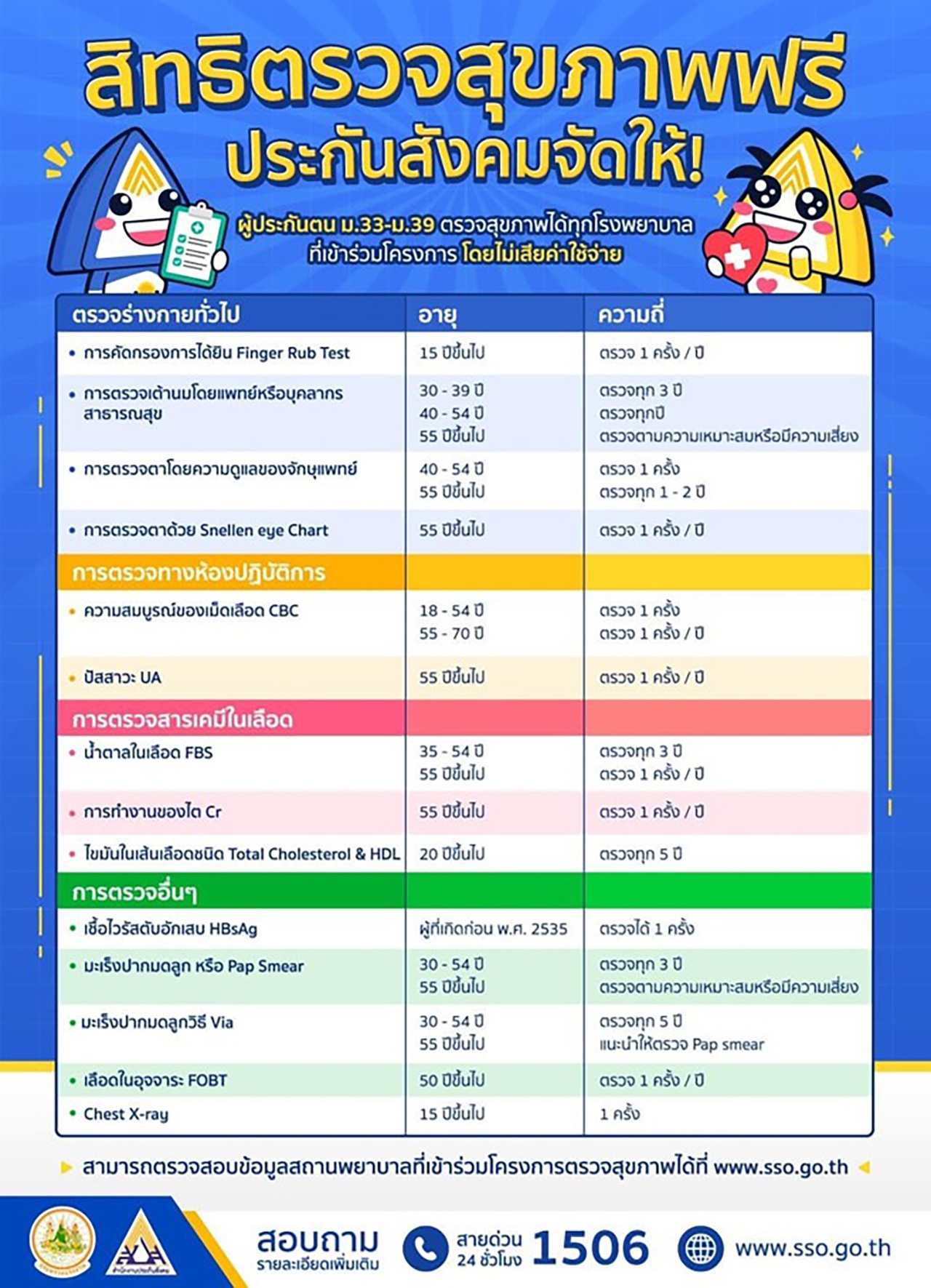 ตรวจสุขภาพฟรี!! 14 รายการ ประกันสังคม เชิญชวนผู้ประกันมาตรา 33 และมาตรา 39 ใช้สิทธิตรวจสุขภาพฟรีได้ทุกโรงพยาบาลที่เข้าร่วมโครงการ โดยไม่เสียค่าใช้จ่าย