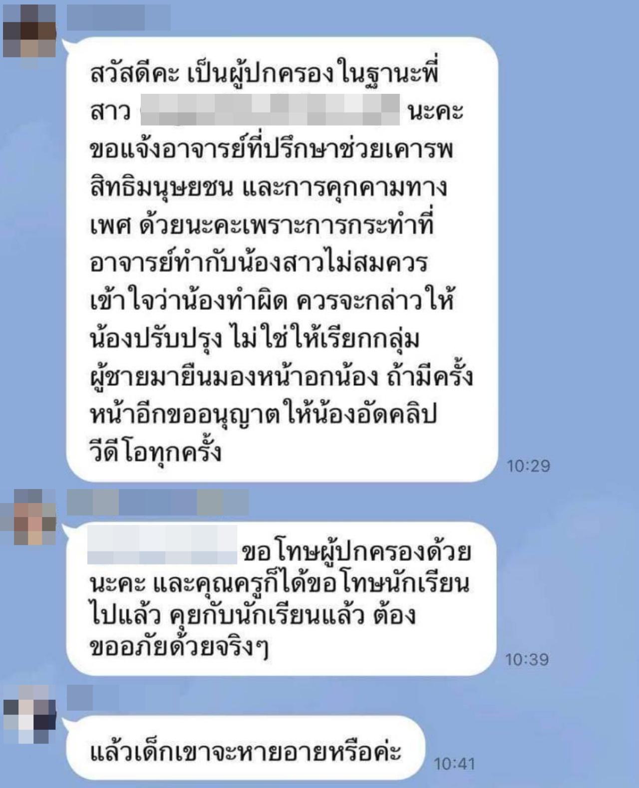 ทั้งนี้ ผู้สื่อข่าวได้รับข้อมูลเพิ่มเติมจากผู้ปกครองของเด็กคนหนึ่ง นำแชตไลน์กลุ่มห้องเรียน ซึ่งเป็นห้องของนักเรียนคนดังกล่าว มาให้ผู้สื่อข่าวดู โดยผู้ปกครองของนักเรียนหญิงที่ถูกทำโทษ ได้แชตถามครูประจำชั้นว่า รู้สึกไม่พอใจกับวิธีการลงโทษนักเรียนแบบนี้ โดยมีการตั้งคำถามกับครูรายนี้ว่า "ทำแบบนี้เด็กจะไม่อับอายหรือ และขอให้อาจารย์ที่ปรึกษาช่วยเคารพสิทธิมนุษยชน และการคุกคามทางเพศด้วย เพราะการกระทำที่อาจารย์ทำเป็นสิ่งที่ไม่สมควร เข้าใจว่าเด็กทำผิด แต่ควรจะกล่าวให้เด็กปรับปรุง ไม่ใช่ให้เรียกกลุ่มผู้ชายมายืนมองหน้าอก ถ้ามีครั้งหน้าอีกขออนุญาตให้เด็กอัดคลิปทุกครั้ง ก่อนที่ครูสาวจะตอบกลับว่า "ขอโทษผู้ปกครองด้วยนะคะ และครูก็ได้ขอโทษนักเรียนไปแล้ว คุยกับนักเรียนแล้ว ต้องขออภัยด้วยจริงๆ"