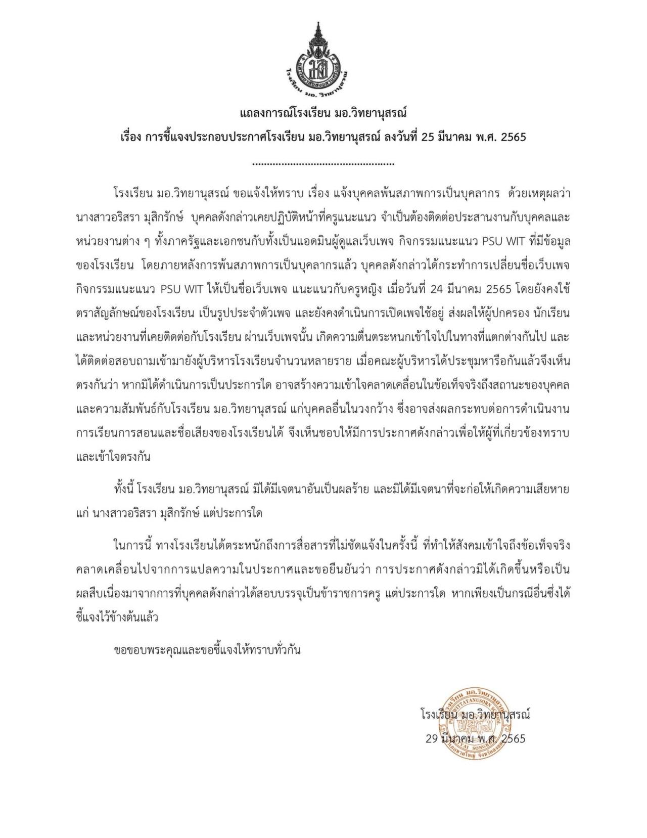 ความคืบหน้าเรื่องนี้ โรงเรียน มอ.วิทยานุสรณ์ ได้ออกมาโพสต์แถลงการณ์ชี้แจง ลงวันที่ 25 มีนาคม 2565 ผ่านเฟซบุ๊ก ซึ่งระบุว่า โรงเรียน มอ.วิทยานุสรณ์ ขอแจ้งให้ทราบ เรื่องแจ้งบุคคลพ้นสภาพการเป็นบุคลากร ด้วยเหตุผลว่า น.ส.อริสรา มุสิกรักษ์ บุคคลดังกล่าวเคยปฏิบัติหน้าที่ครูแนะแนว จำเป็นต้องติดต่อประสานงานกับบุคคลและหน่วยงานต่างๆ ทั้งภาครัฐและเอกชน กับทั้งเป็นแอดมินผู้ดูแลเว็บเพจ กิจกรรมแนะแนว PSU WIT ที่มีข้อมูลของโรงเรียน