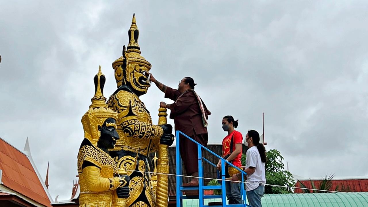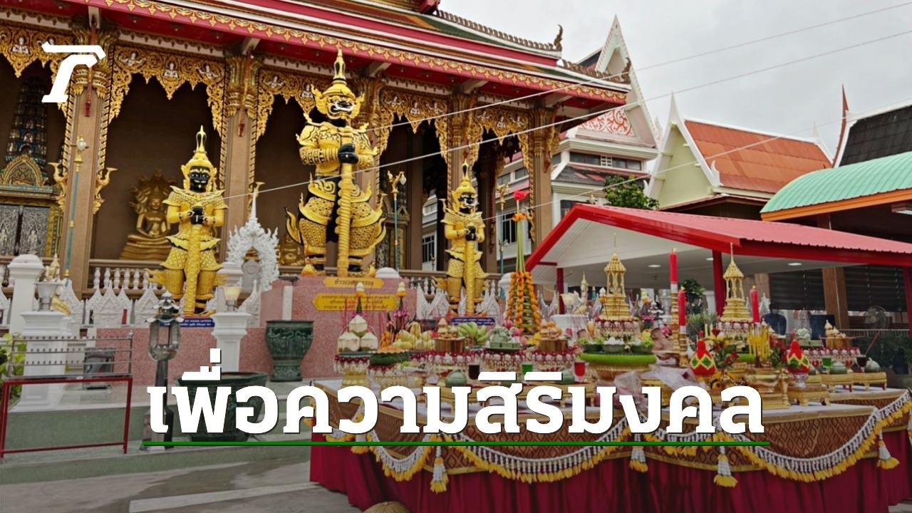 ประชาชนเดินทางมาร่วมพิธีบวงสรวงองค์ "ท้าวเวสสุวรรณโณ" วัดนวลจันทร์ พร้อมเปิดให้กราบไหว้สักการะเพื่อความเป็นสิริมงคล