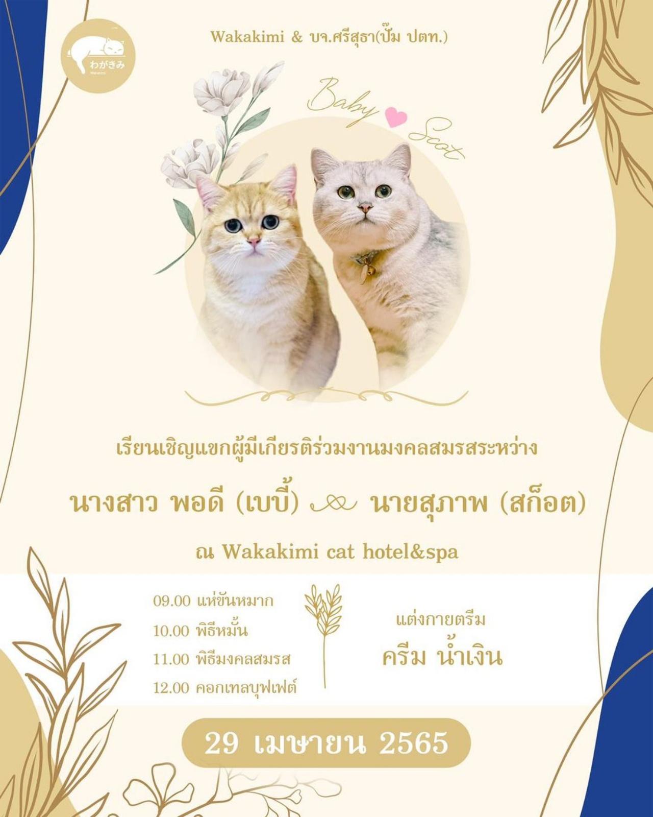 กลายเป็นกระแสที่ถูกพูดถึงในโลกโซเชียล และเหล่าทาสแมว เมื่อเฟซบุ๊กเพจ "Wakakimi わがきみ Cat Hotel & Spa-โรงแรมและสปาแมวสไตล์ญี่ปุ่น" ได้โพสต์ภาพป้ายเรียนเชิญแขกผู้มีเกียรติร่วมพิธีมงคลสมรส ของ 2 แมวเหมียว โดยเหมียวว่าที่เจ้าบ่าว มีนามว่า นายสุภาพ (สก็อต) และว่าที่เจ้าสาวคือ นางสาวพอดี (เบบี้) ซึ่งในพิธีสมรส ก็จะเริ่มตั้งแต่การแห่ขันหมาก ต่อด้วยพิธีหมั้น พิธีมงคลสมรส และเลี้ยงฉลองคอกเทลบุฟเฟ่ต์ ในวันที่ 29 เมษายนนี้ ที่ Wakakimi Cat Hotel & Spa ธีมแต่งกาย สี น้ำเงิน-ครีม ส่วนของชำร่วย อุบไว้ก่อน แต่มีเซอรไพรส์แน่นอน