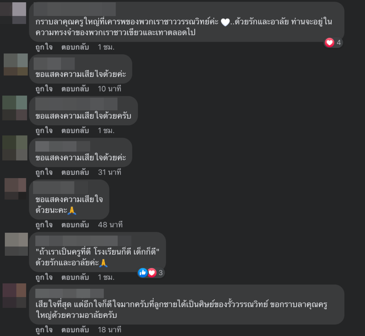 ทั้งนี้ หลังโพสต์ดังกล่าวถูกแชร์ออกไป ก็มีศิษย์เก่า และผู้ที่ติดตามข่าวของโรงเรียนวรรณวิทย์ เข้ามาแสดงความอาลัยเป็นจำนวนมาก.