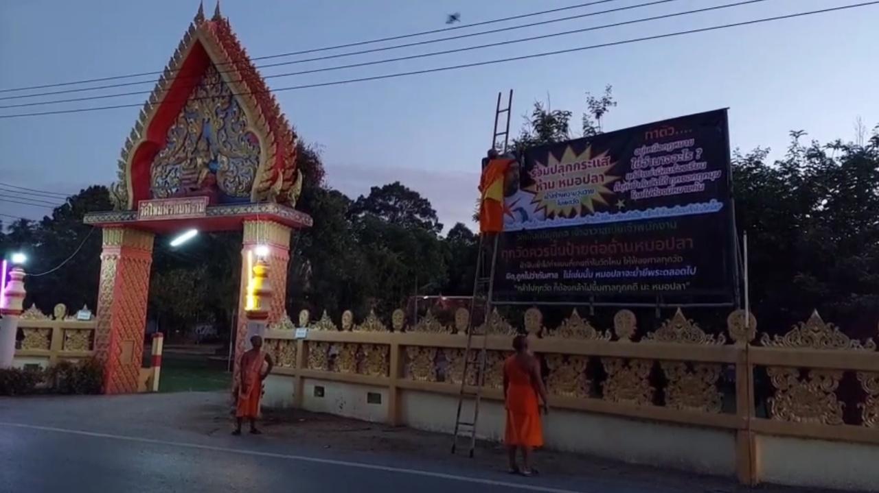 โดย พระบุญมา สุจินโน รองเจ้าอาวาส เปิดเผยว่า สถานที่ติดป้ายนั้น เป็นการติดป้ายสาธารณะ ใครจะเอาติดประกาศก็ได้ ทางวัดไม่รู้ว่าใครเอามาติดตอนไหน เมื่อเช้านี้ พระครูธีรศาส กิตจาทร เจ้าอาวาส ได้รับคำสั่งจากเจ้าคณะอำเภอพรหมพิราม ให้ปลดป้ายดังกล่าวลงมาเนื่องจากมีการวิพากษ์วิจารณ์ในแง่ลบเป็นอย่างมาก ทางวัดจึงได้ทำการปลดป้ายลง เพราะเราไม่รู้เรื่องด้วย วัดทุกวัดมีทั้งคนชอบไม่ชอบ อันที่จริงที่หมอปลาทำก็ทำถูกแล้ว อันไหนไม่ดีพระรูปไหนไม่ดีก็เอาออกไป ศาสนาจะได้ดีขึ้น วัดไม่มีนโยบายต่อต้าน หรือกีดกั้นเรื่องแบบนี้ ตอนนี้ทางวัดกำลังสร้างกุฏิอยู่ พระก็ช่วยกันทำงานจึงไม่เห็น กล้องวงจรปิดวัดก็ไม่มี เลยไม่รู้ว่าใครเอามาติดตอนไหน อีกทั้งวัดเราไม่มีประตู ใครจะเข้าออกตอนไหนก็ทำได้