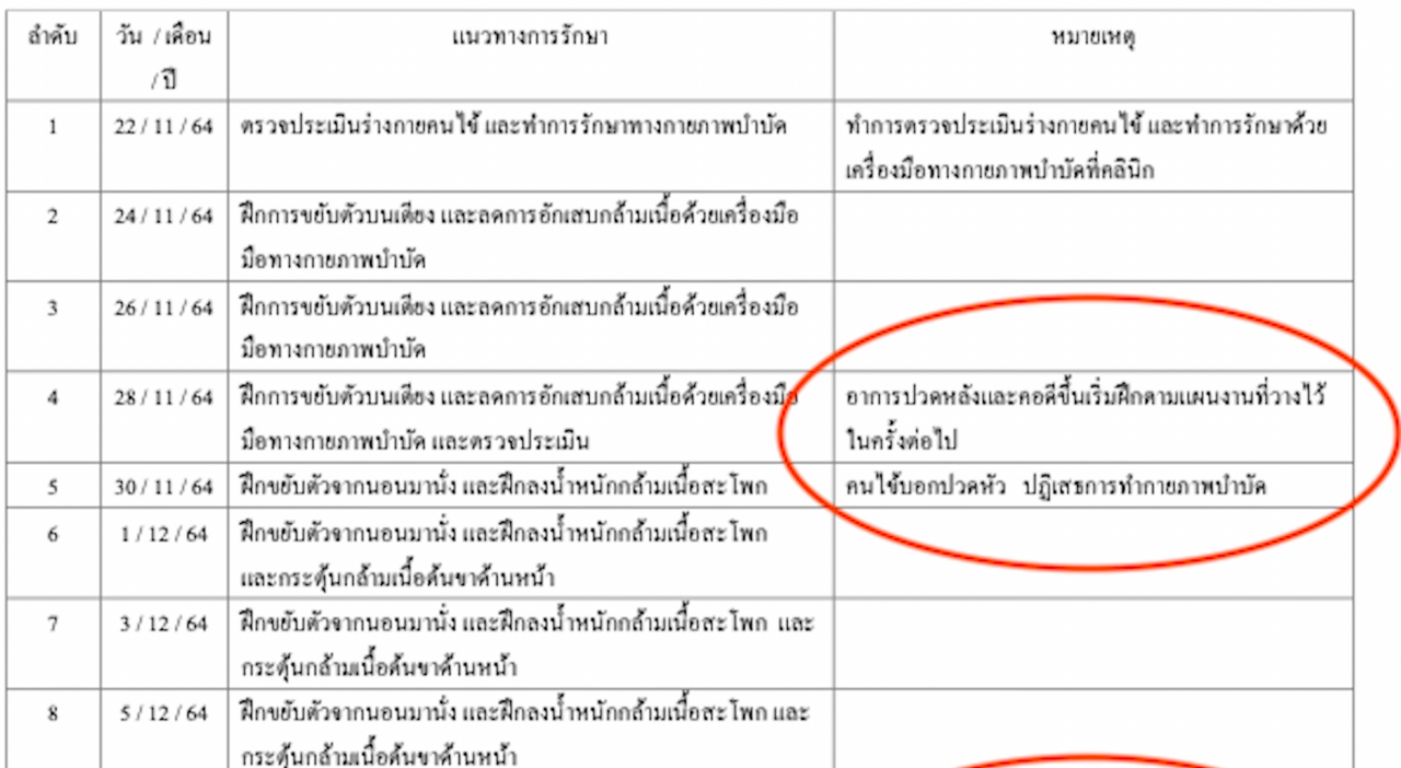 จากตารางการรักษา พบว่า คนไข้มีอาการปวดหลัง มีไข้ ปวดหัว ตั้งแต่กายภาพครั้งที่ 4 คนไข้ขอพักไม่ทำกายภาพ อ้างว่าไม่มีแรง ซึ่งตนได้ขอให้หมอถ่ายคลิปคนไข้ลุกขึ้นจากเตียงส่งมาให้ได้ และตั้งแต่ได้รับคลิปตนก็ได้รับแจ้งจากคุณหมอว่าคนไข้ไม่อยากเข้ารับการรักษาแล้ว