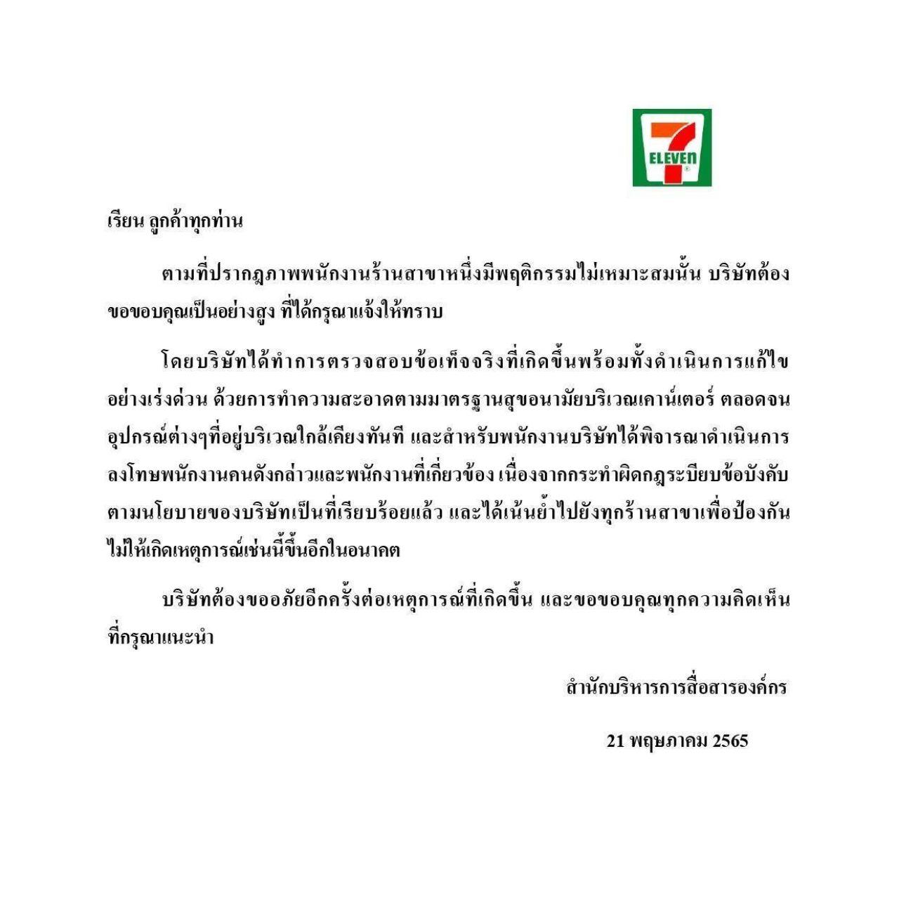 เกี่ยวกับกรณีที่เกิดขึ้น ต่อมาสํานักบริหารการสื่อสารองค์กร บริษัท ซีพี ออลล์ จํากัด (มหาชน) ได้ออกหนังสือชี้แจง โดยระบุว่า ตามที่ปรากฏภาพพนักงานร้านสาขาหนึ่งมีพฤติกรรมไม่เหมาะสมนั้น บริษัทต้องขอขอบคุณเป็นอย่างสูง ที่ได้กรุณาแจ้งให้ทราบ