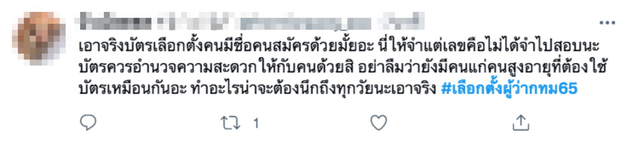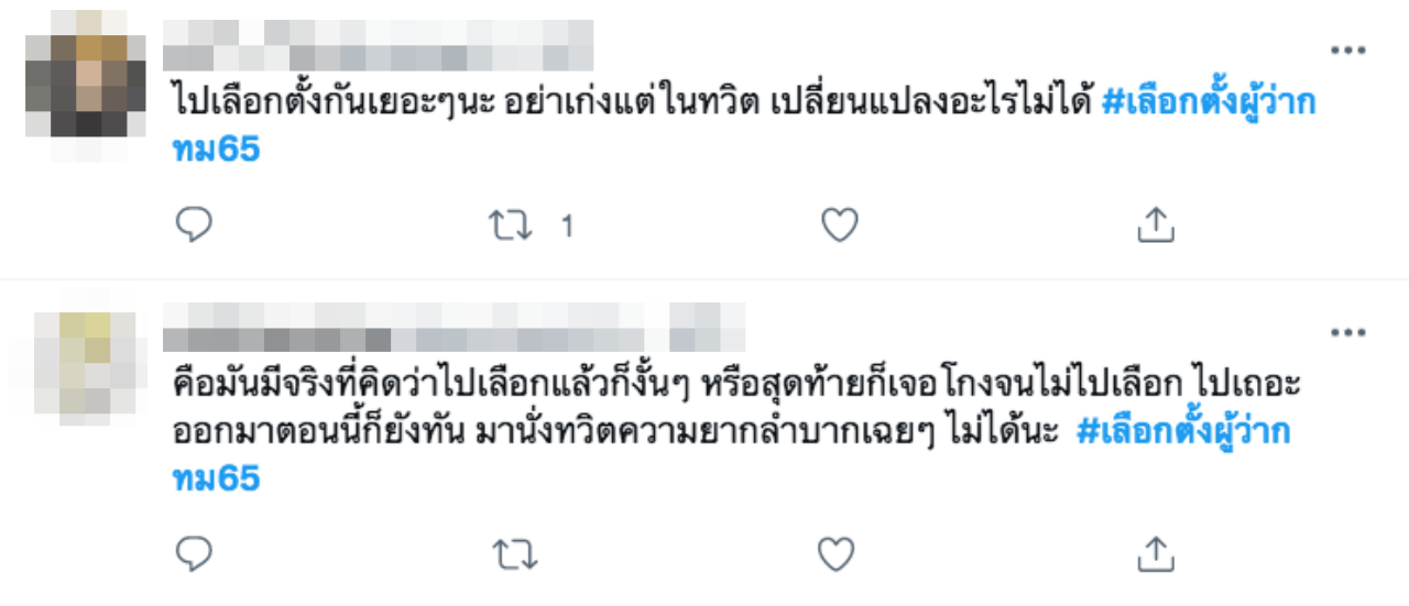 อย่างไรก็ตาม บรรยากาศการเลือกตั้งในวันนี้ ยังเป็นไปด้วยความเรียบร้อย ยังไม่พบความผิดปกติใดๆ และในโลกโซเชียลเองก็มีการแสดงความคิดเห็น เชิญชวนกันไปเลือกตั้ง พร้อมกับติดแฮชแท็ก #เลือกตั้งผู้ว่ากทม65 เพื่ออนาคตของคนกรุงเทพฯ เช่นเดียวกับคนที่มีทะเบียนบ้านอยู่ต่างจังหวัด แต่ต้องมาทำงานในกรุงเทพฯ ก็ฝากความหวังไว้ที่คน กทม. ด้วย ขณะที่บางคนเอง ก็เล่าความตื่นเต้นที่ได้สิทธิ์เลือกตั้งเป็นครั้งแรกในชีวิต.