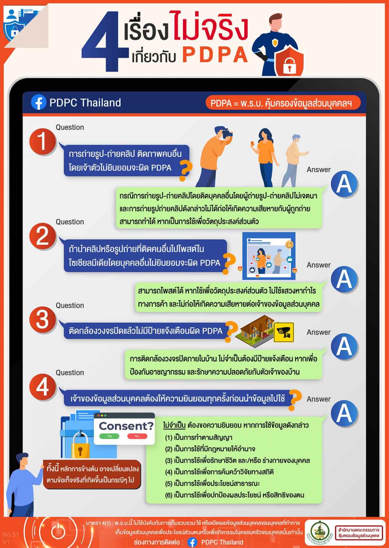 แฟนเพจ PDPC Thailand ของสำนักงานคณะกรรมการคุ้มครองข้อมูลส่วนบุคคล (สคส.) ได้โพสต์ข้อความว่า 4 เรื่องไม่จริงเกี่ยวกับ PDPA