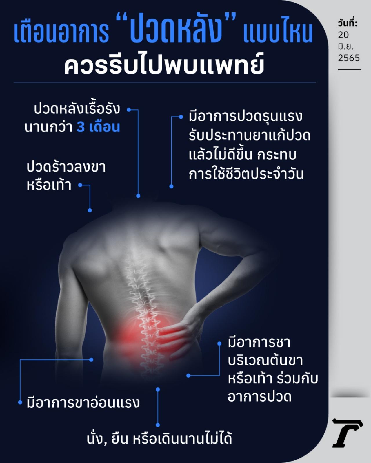 - อันตรายกว่าที่คิด "อาการปวดหลัง" อาจเป็นสัญญาณเตือนถึงความผิดปกติ จำเป็นต้องรีบพบแพทย์เพื่อวินิจฉัยและรักษาอย่างถูกต้อง