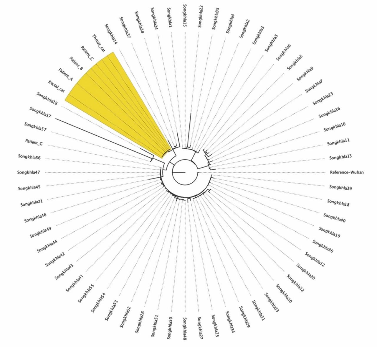 และอีกส่วนคือ การตรวจลำดับเบส และรหัสพันธุกรรม จากพ่อลูกเจ้าของแมว แมว และสัตวแพทย์ พบว่า ตรงกัน นอกจากนี้ยังมีการตรวจเทียบเคียงกับการแพร่ระบาดของโควิด คลัสเตอร์ใหญ่ๆ หลายจุดใน จ.สงขลา เนื่องจากอาจเป็นไปได้ว่า แมวอาจรับเชื้อมาจากชุมชนหรือแหล่งอื่นหรือไม่ แต่พบว่า ไม่ตรงกัน