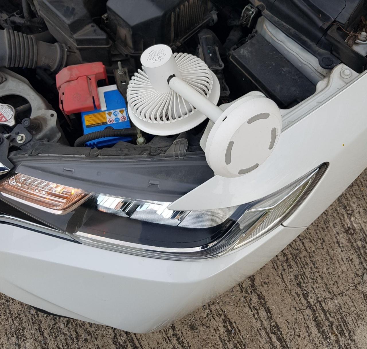 แต่ขับไปสักพักก็ได้ยินเสียงแมวร้องอีกรอบ ครั้งนี้ได้ยินเสียงชัดเจนเลยเลี้ยวรถเข้าไปจอดในซอย ตนกับแฟนได้ช่วยกันหาพักใหญ่ เปิดฝากระโปรงดูห้องเครื่องก็ยังไม่เจอ แต่ยังได้ยินเสียงแมวร้อง เลยเคาะรถรอบคันแล้วกลับมาดูห้องเครื่องอีกรอบ พบว่ามีลูกแมวนอนขดอยู่ในซอกเล็กๆ ข้างแบตเตอรี่ ไม่สามารถสอดมือเข้าไปได้ เลยโทรขอความช่วยเหลือจากเจ้าหน้าที่กู้ภัย ระหว่างรอได้นำพัดลมมาเป่าให้น้องด้วย ใช้เวลาประมาณครึ่งชั่วโมงกู้ภัยก็มาถึง เนื่องจากเป็นช่วงเวลารถติดมาก