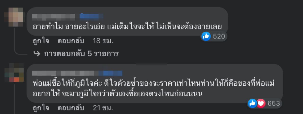 ส่วนการซื้อของให้ตัวเองนั้น มันก็คือความภูมิใจของตัวเอง ไม่เกี่ยวกับความรักของพ่อแม่ เป็นต้น.