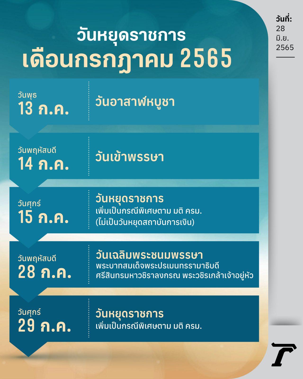 - วันศุกร์ที่ 29 กรกฎาคม 2565 : วันหยุดราชการเพิ่มเป็นกรณีพิเศษตาม มติ ครม. (ภาคเอกชน-ธนาคารหยุดด้วย)