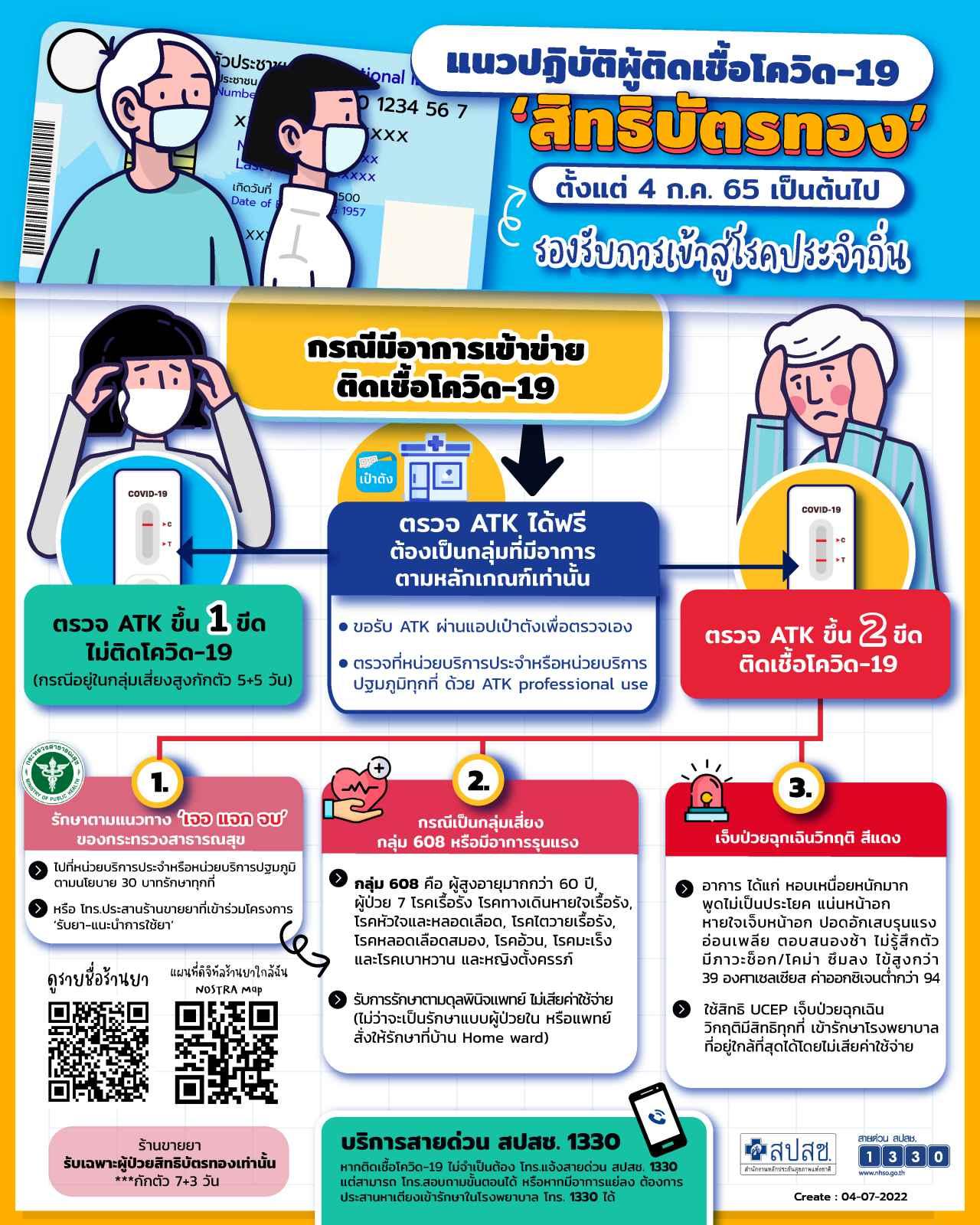 เมื่อมีอาการสงสัยว่าจะติดเชื้อโควิด-19 สามารถเข้ารักษาที่แผนกผู้ป่วยนอกตามแนวทางเจอแจกจบของกระทรวงสาธารณสุข หรือโทรประสานร้านยาเพื่อรับยาตามโครงการเจอแจกจบที่ร้านยาได้เช่นกัน ซึ่งร้านยาจะส่งยาให้โดยไม่ต้องไปที่ร้านยา เมื่อติดโควิดแล้วไม่จำเป็นต้องโทรแจ้งสายด่วน สปสช. 1330 แต่หากมีข้อสงสัยว่าจะต้องทำอย่างไร โทรมาสอบถามขั้นตอนได้ หรือหากมีอาการแย่ลง ต้องการประสานหาเตียงเข้ารักษาในโรงพยาบาลก็โทรมาได้เช่นกัน”