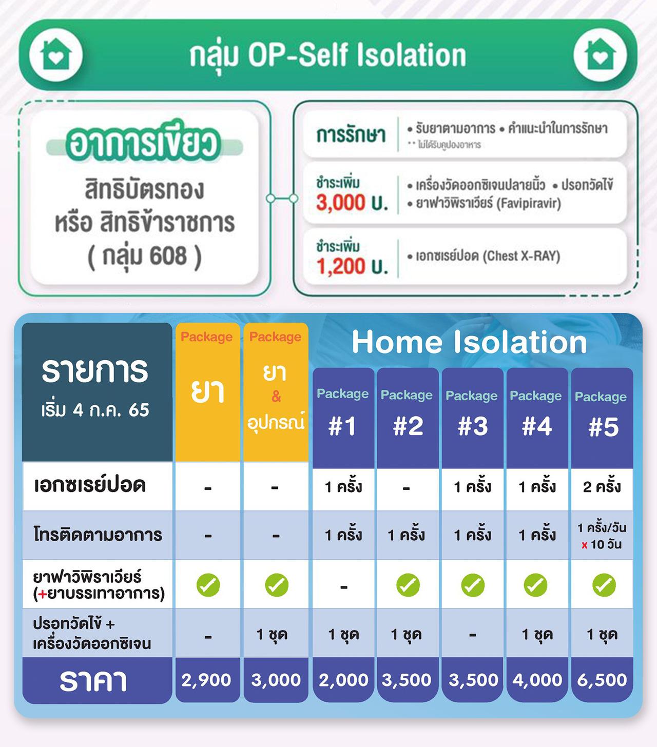 ซึ่งจากการสำรวจของทีมข่าว พบว่า โรงพยาบาลเอกชนหลายแห่ง ได้โพสต์แพ็กเกจ Home Isolation สำหรับผู้ป่วยโควิดที่มีผล ATK หรือ RT-PCR ยืนยันว่าพบเชื้อ ซึ่งไม่มีโรคประจำตัวรุนแรงหรือควบคุมไม่ได้ แต่หากต้องการยาฟาวิพิราเวียร์ ยาต้านไวรัสอื่นๆ หรือต้องการให้แพทย์โทรติดตามอาการ จะต้องจ่ายเงินเพิ่ม โดยมีราคาตั้งแต่ 2,000-6,500 บาท ซึ่งขึ้นอยู่กับการจัดแพ็กเกจของแต่ละโรงพยาบาล
