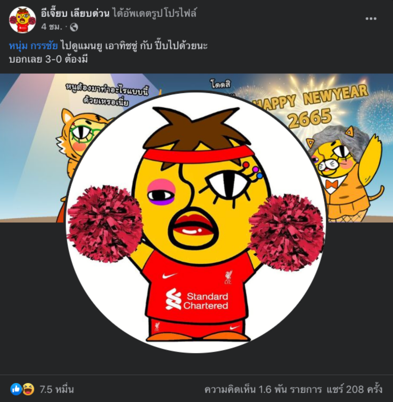 นอกจากนี้ ยังได้โพสต์ถึงเพื่อนรักอย่าง "หนุ่ม กรรชัย" พิธีกรชื่อดังว่า "หนุ่ม กรรชัย ไปดูแมนยู เอาทิชชู่ กับ ปี๊บไปด้วยนะ บอกเลย 3-0 ต้องมี"