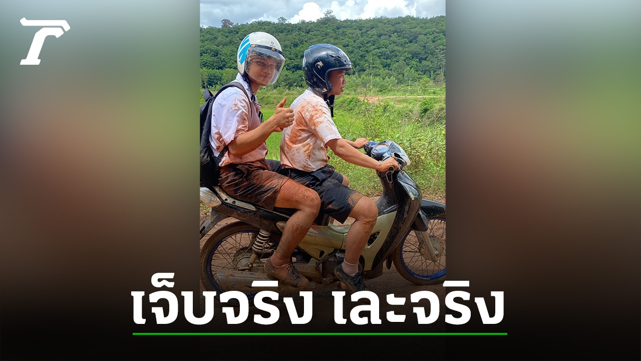 ไม่ได้จัดฉาก 2 นักเรียนเปิดใจ ขี่มอเตอร์ไซค์ ผ่านถนนที่มีลักษณะเป็นทะเลโคลน หลบรถจนลื่นล้ม ชุดนักเรียนสีขาว เละ!