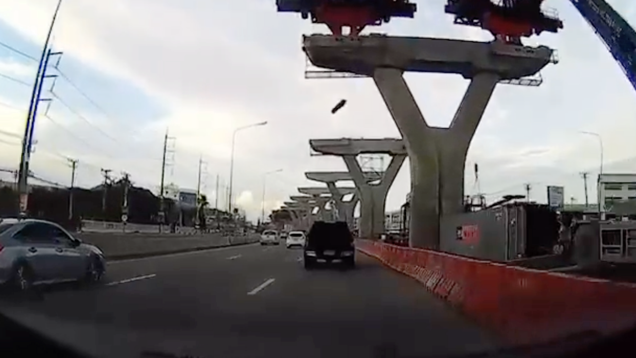 สุดหวาดเสียว รถกระบะขับผ่านบริเวณก่อสร้างทางด่วน อยู่ๆ เหล็กร่วงจากตอม่อลงมาทับจนรถลอย เฉียดกระจกไปนิดเดียว