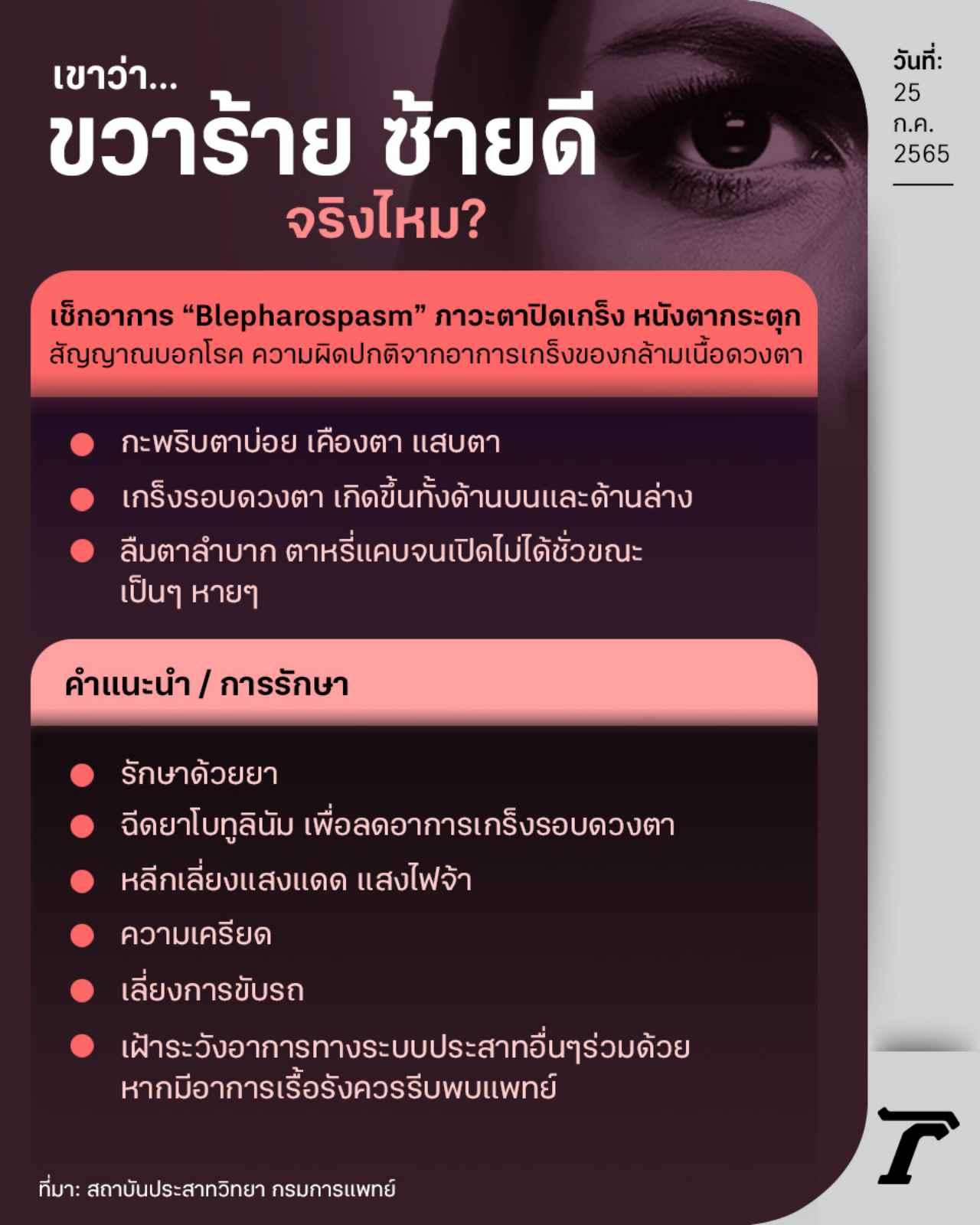 กรมการแพทย์เตือน ภาวะตาปิดเกร็ง หนังตากระตุก อาจไม่ใช่ลางบอกเหตุ แต่เป็นสัญญาณเตือนเรื่องสุขภาพ หมั่นสังเกตอาการ ควรปรึกษาแพทย์เพื่อรับการรักษา