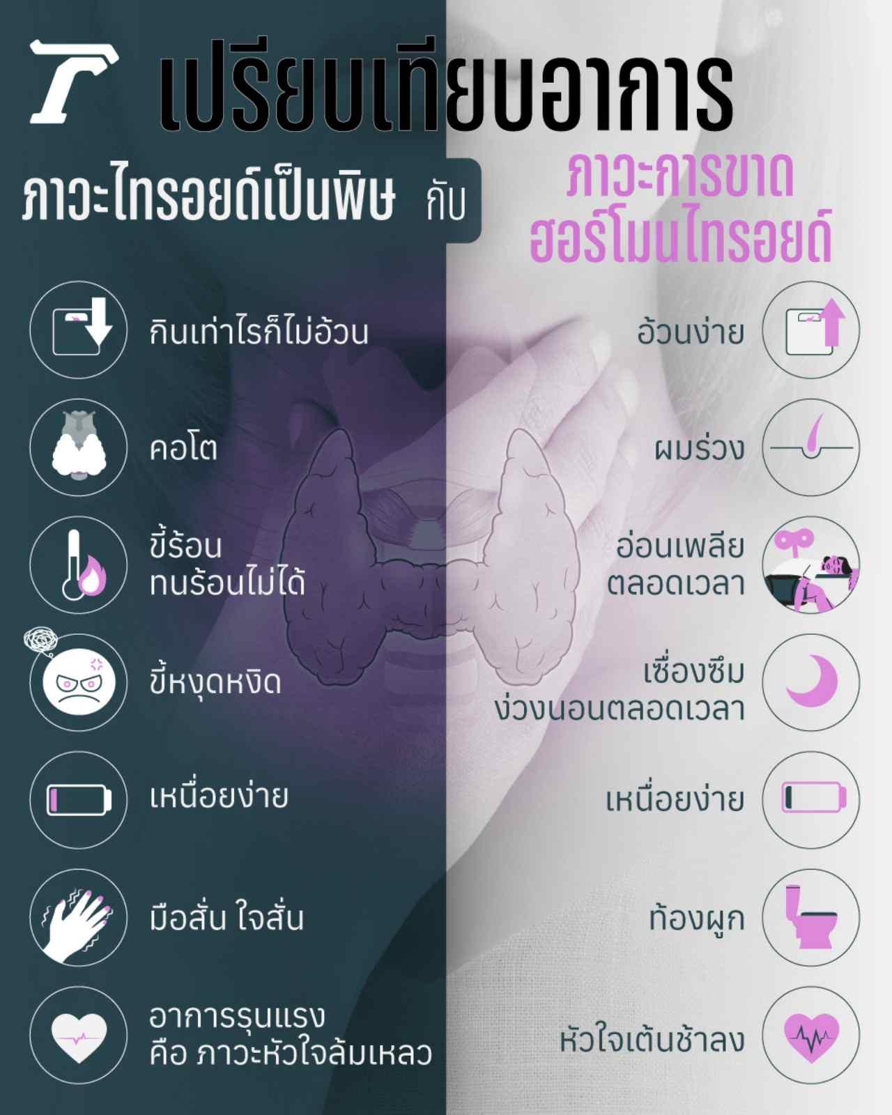- อาการของภาวะไทรอยด์เป็นพิษ คือ ขี้ร้อน ทนร้อนไม่ได้ ขี้หงุดหงิด เหนื่อยง่าย มือสั่น ใจสั่น รับประทานเท่าไรก็ไม่อ้วน คอโต จนไปถึงอาการที่รุนแรงคือ ภาวะหัวใจล้มเหลว
