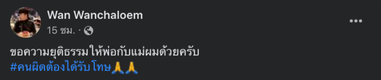 ต่อมา นายวันเฉลิม โตมา อายุ 23 ปี ลูกชายผู้เสียชีวิต ได้โพสต์ข้อความผ่านเฟซบุ๊ก ระบุว่า "ขอความยุติธรรมให้พ่อกับแม่ผมด้วยครับ #คนผิดต้องได้รับโทษ"